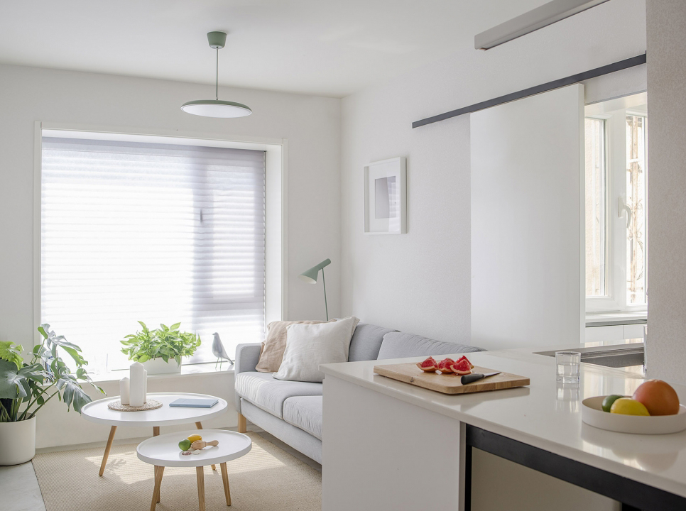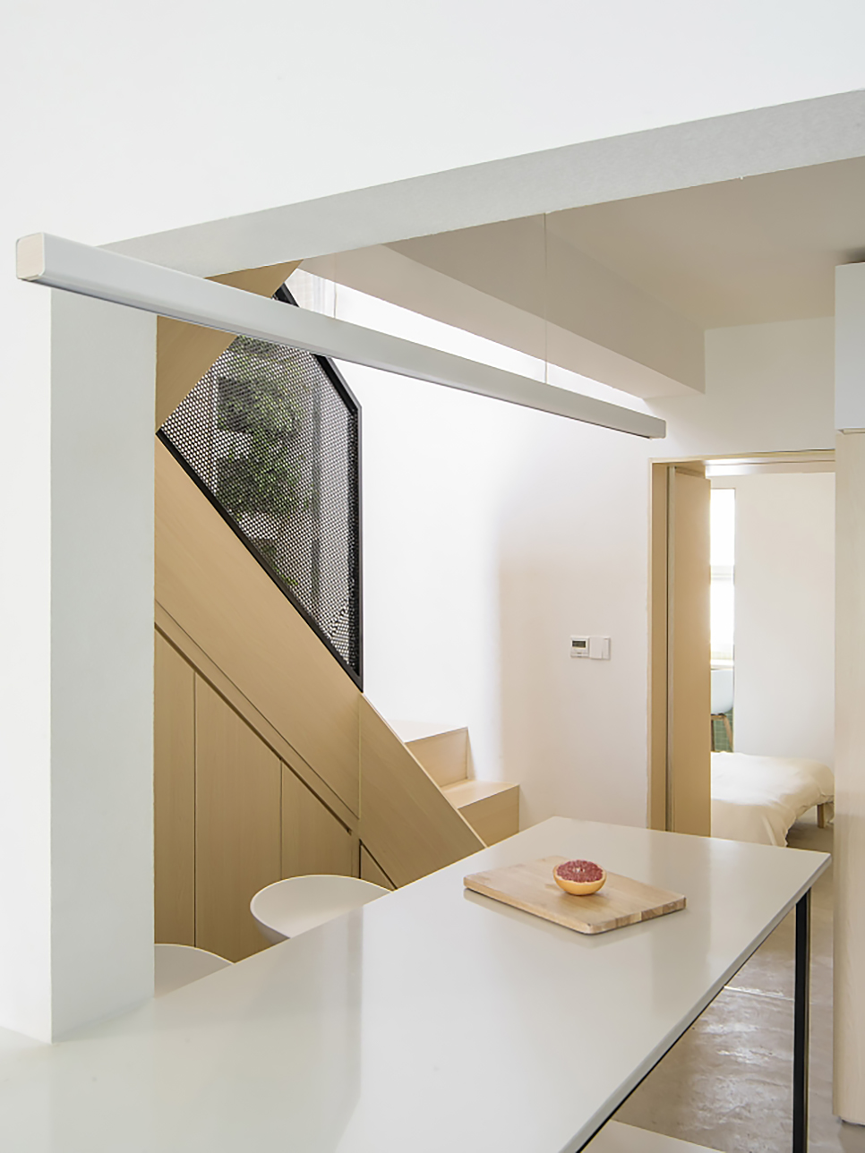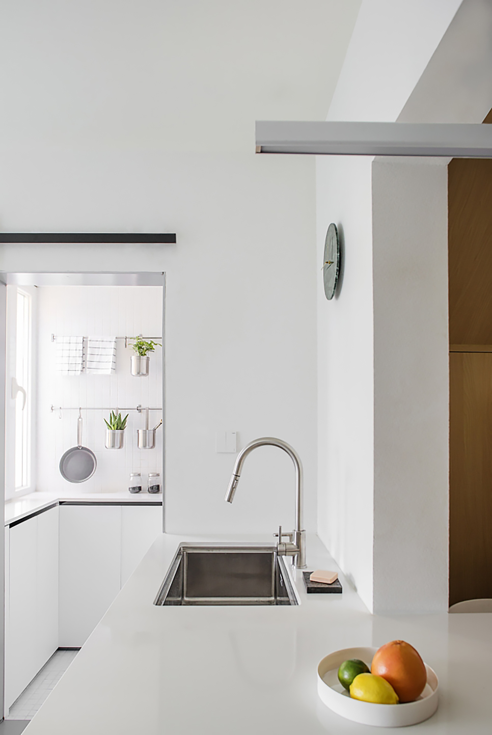公寓的主人坚持需要封闭的厨房,以防止厨房油烟进入客厅。优思建筑将引入推拉门将厨房区域灵活分隔,同时保证客厅及用餐区空间的宽敞及开放。厨房的台面向外延伸而形成餐桌,使其既适合作为用餐又适合作为烹饪的操作台面。