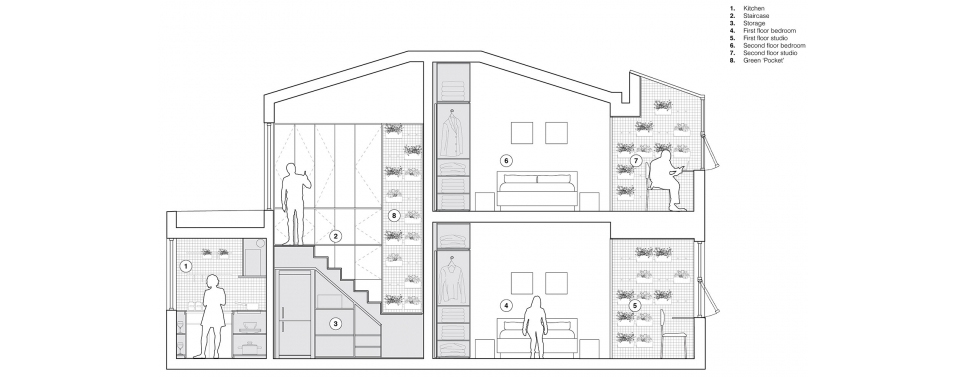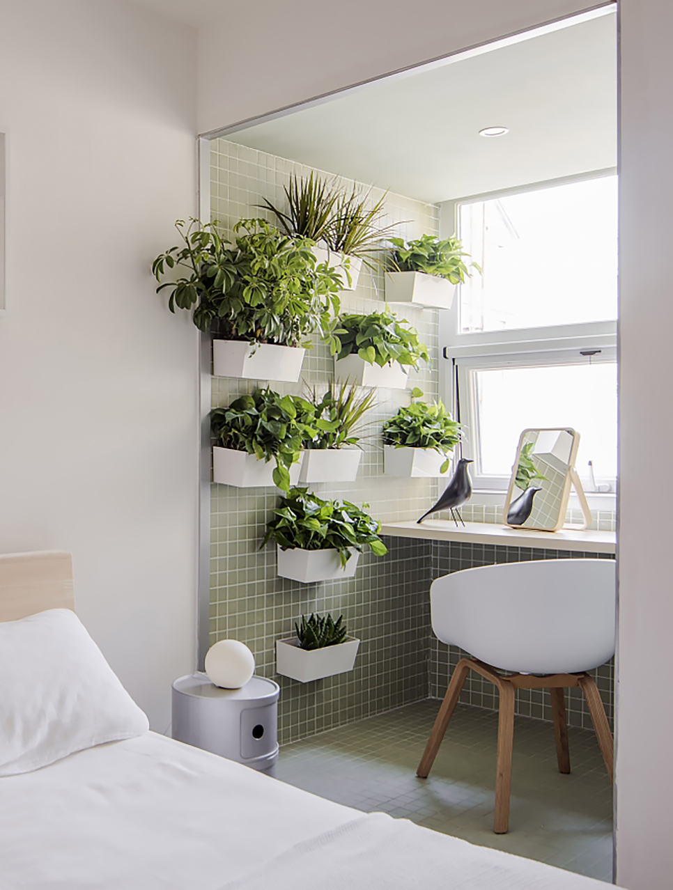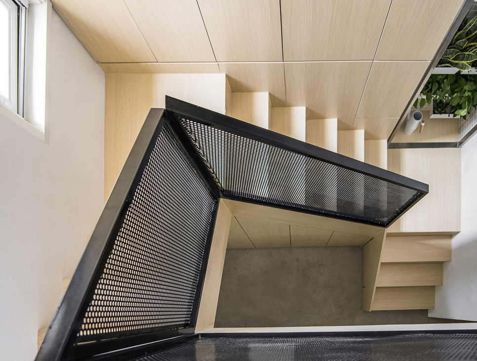 A new staircase is introduced in the centre part of the apartment, which makes the brighter spaces available for the living room and dining area. A void is created to place the staircase as the centrepiece and to channel daylight from the second floor to the darkest part of the lower floor, simultaneously showcasing the double height and spaciousness of the loft. A black balustrade adds contrast to the apartment and accentuates the architectural importance of the staircase.One hundred plants are growing inside tiled alcoves placed through the apartment. With the flexible planter wall system, this can fulfil the couple’s wish to add green to the apartment. The central staircase features a collection of these planters, highlighting the green character of the space upon entering the apartment. A similar strategy is applied to the formerly dead-end and un-usable pocket spaces as they are transformed into a study room and a winter garden.