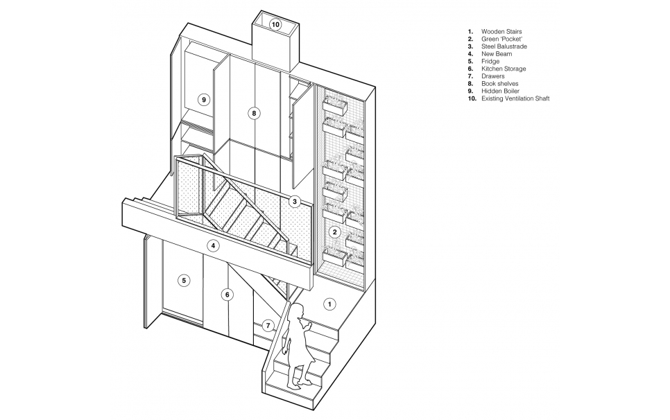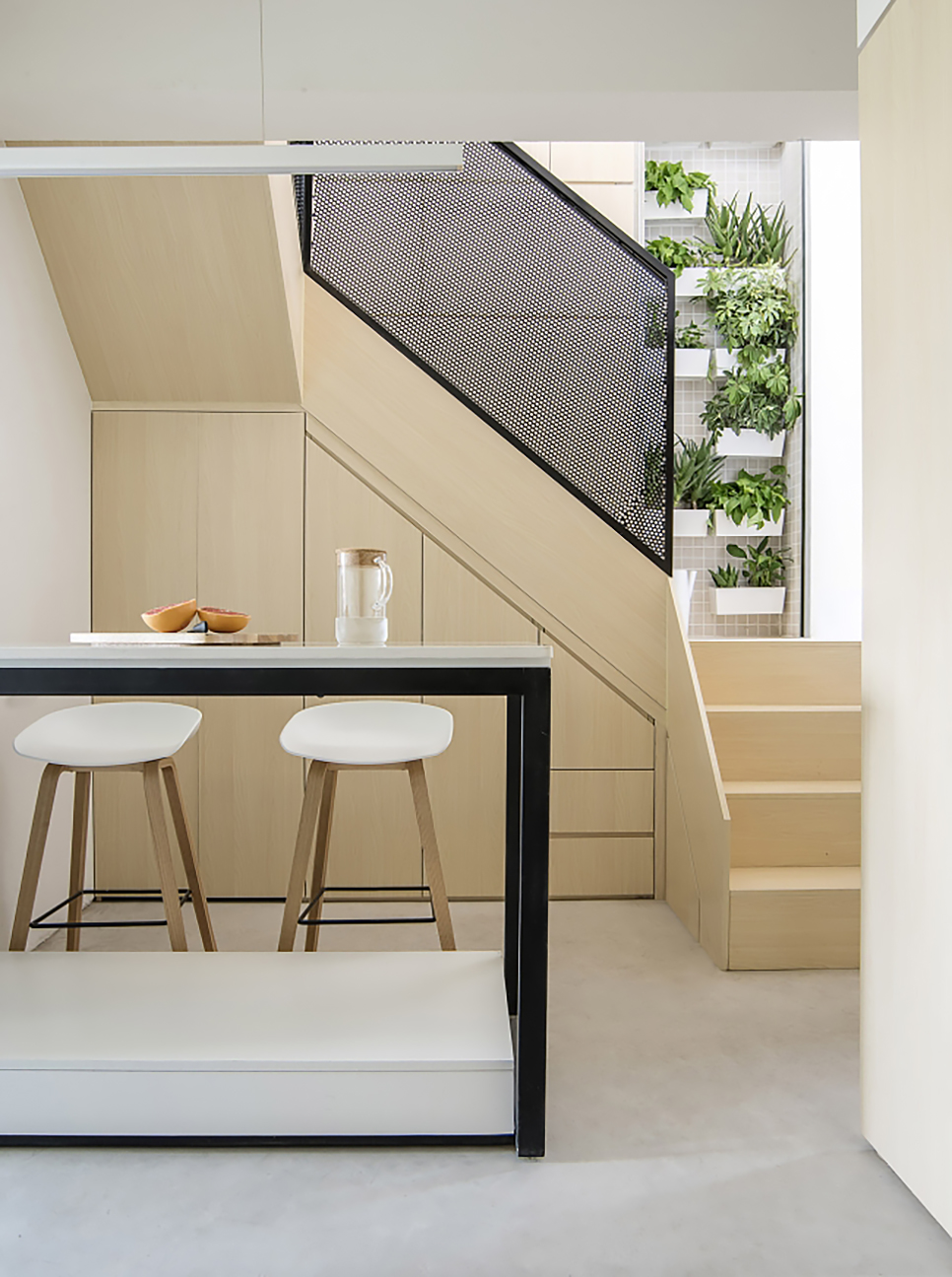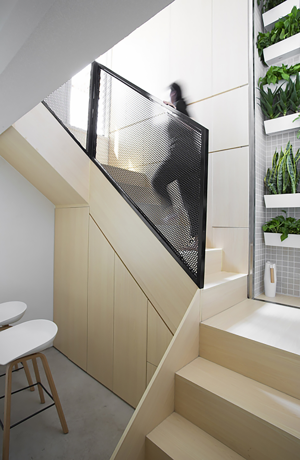 In order to make the small apartment feel spacious, smart solutions were applied to integrate storage space such as utilizing the space underneath and surrounding the staircase and under lower beam locations. Boiler, gas meter, electricity inlet, air-conditioning units, fridge and oven are integrated around the staircase. The first floor bathroom is hidden behind the cabinet wall whilst the second floor hosts a larger bathroom where washing and drying machines are located.