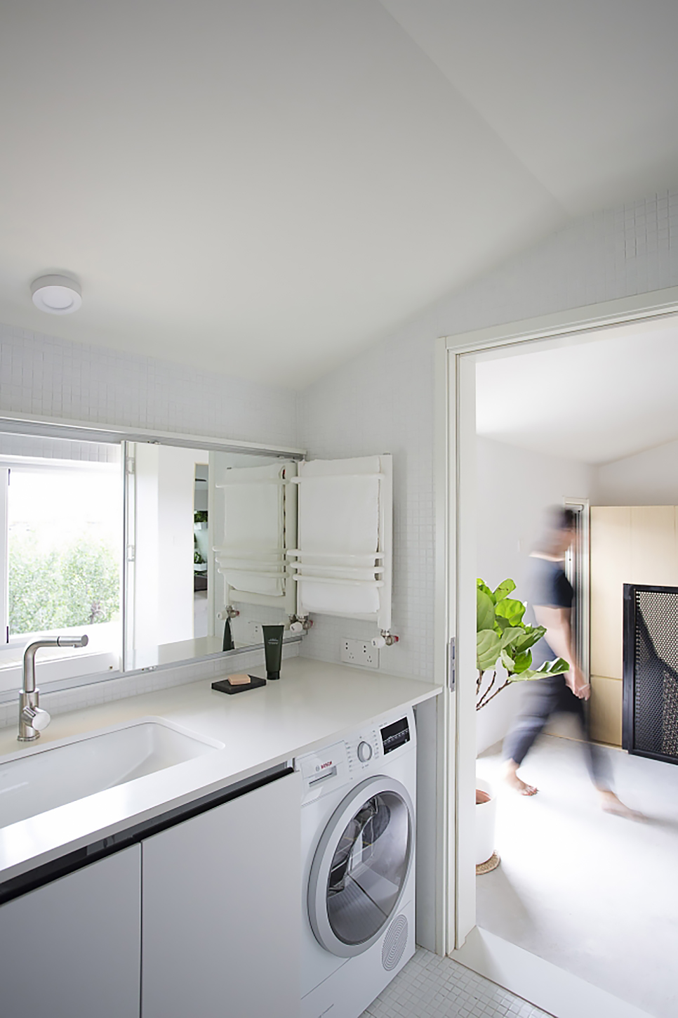 为使原本狭小公寓更显宽敞,设计采用了许多巧妙的方式整合收纳空间,如利用楼梯下及周边的空间以及梁下的剩余空间等。燃气炉、煤气表、电箱、空调、冰箱、烤箱等都布置在楼梯周围的剩余空间。首层的卫生间藏于衣柜的墙内而二层的超大卫生间内则布置洗衣机及烘干机等设备。