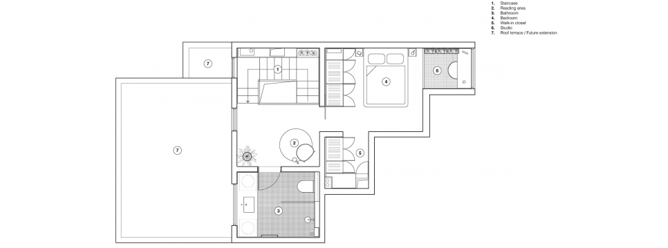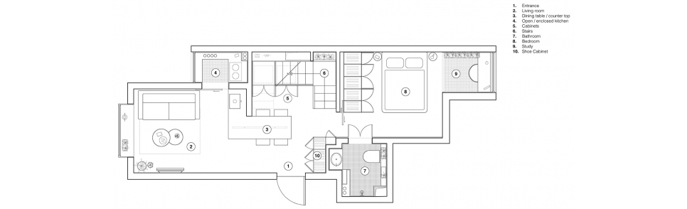 Superimpose converted an 85 square meter, dark, confined and deteriorated loft apartment in Beijing into a bright, green and spacious environment for a young Beijing couple. The transformation was designed and built within a time span of 2 months. Beijing Television (BTV) invited Superimpose to participate in a TV show, which focuses on renovating existing apartments or small houses, showing the transformation results and design process. Superimpose utilised this opportunity to create public awareness towards the poor living and interior standards of Beijing apartments. This project showcases the design philosophy on residential projects based on the principles of natural (day) light, spatiality, neatness/ simplicity, sustainability and its close relation to green. In the existing plan configuration, the living room was situated on the east side of the house and had an obstructive stairs limiting good use of the space. The small pocket spaces at the east side of the house reduced penetration of natural daylight. The lower level suffered from an excessive amount of walls, blocking sunlight and ventilation, which resulted a humid and unhealthy living environment.