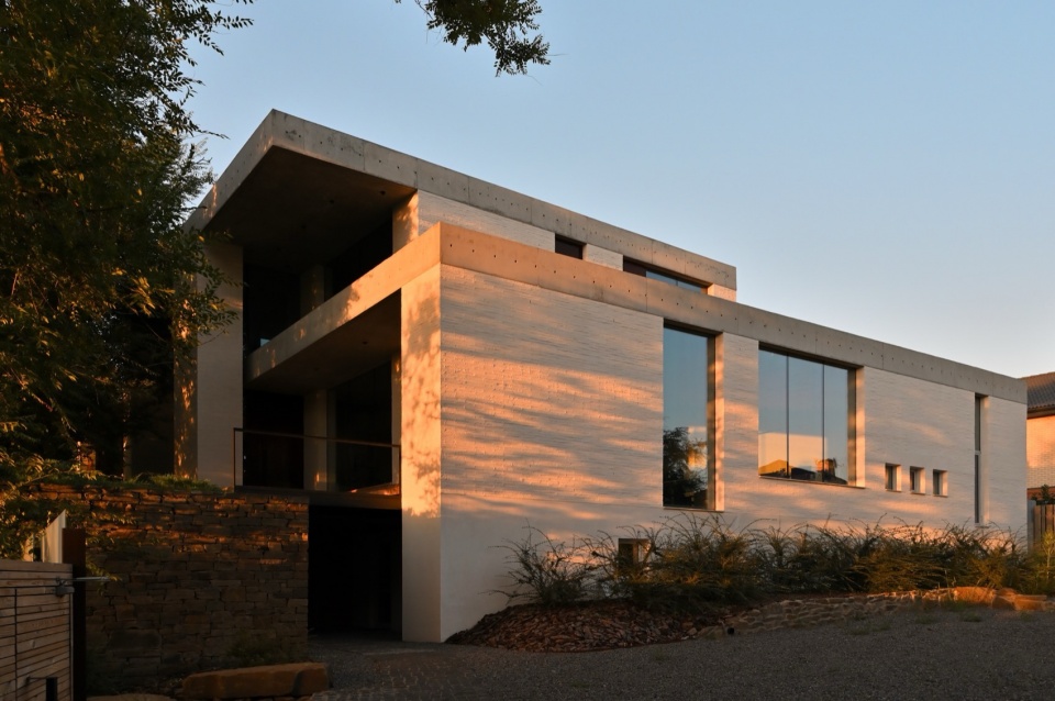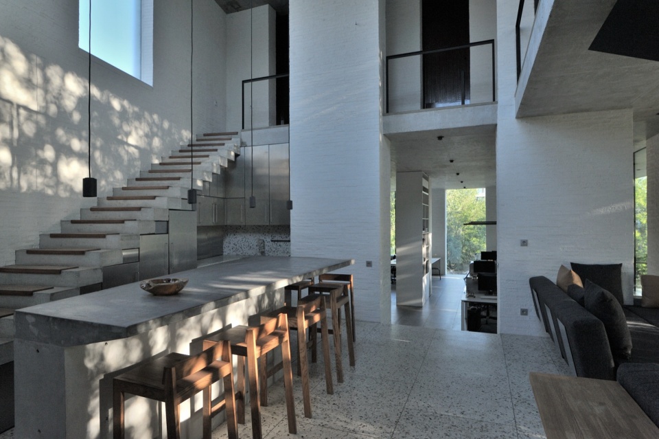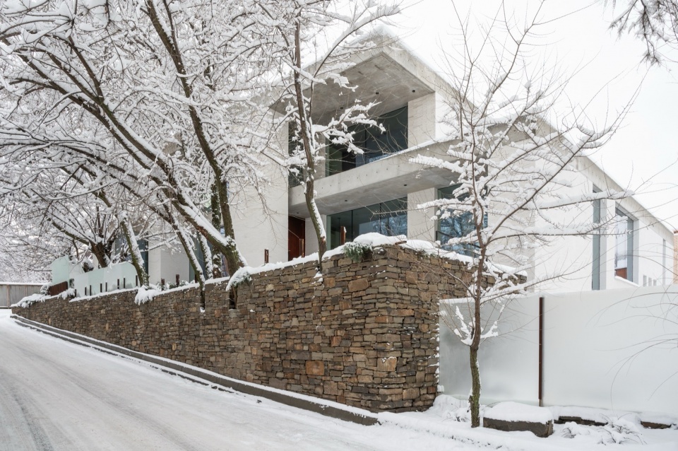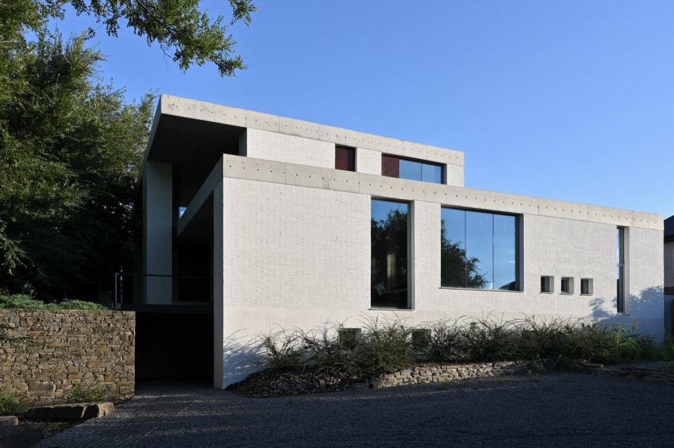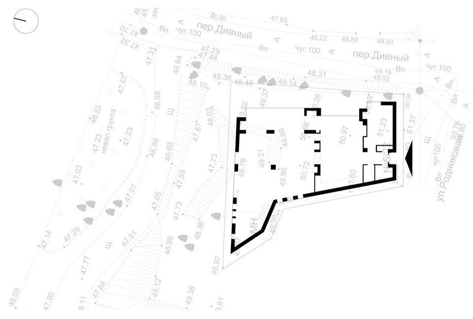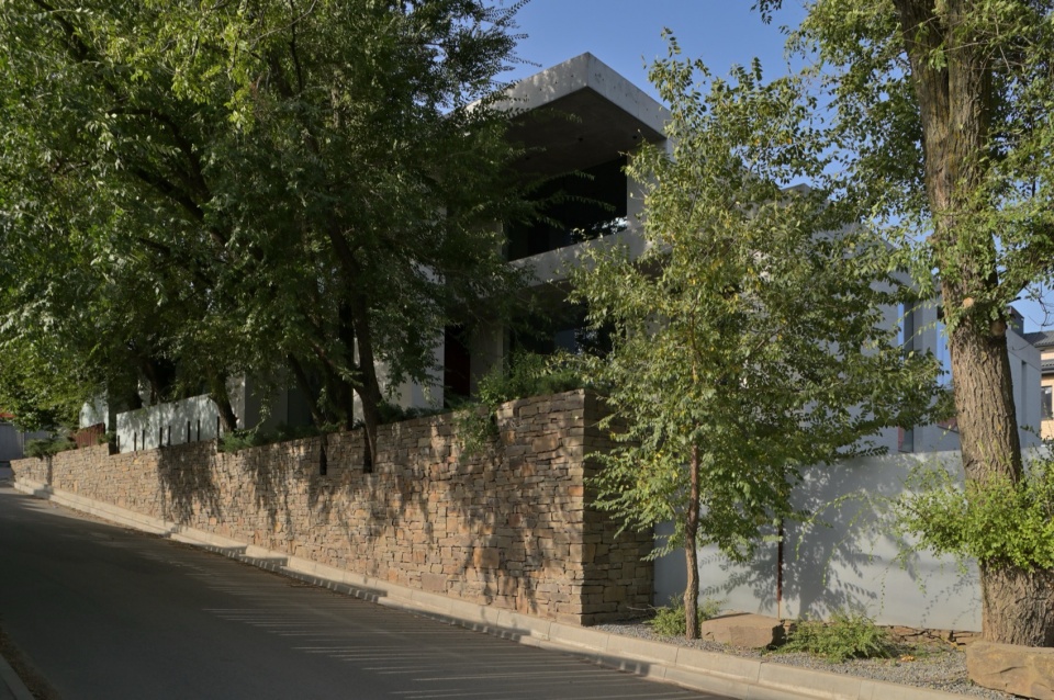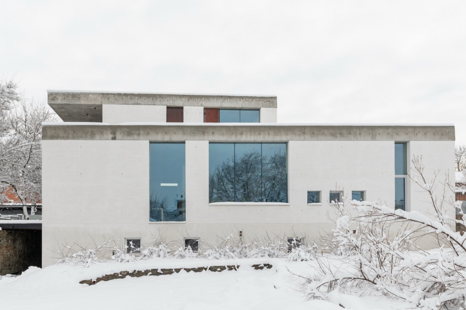 That is why for the interior and the exterior we used the same texture of concrete white bricks, which we had elaborated. It perfectly combines with a light concrete belt, strengths the entirety and sculpturality of the space, gives the sensation of monolithic character of walls and slabs. Relief of the parcel is difficult enough, and we had to deal with it. We turned the building in such a way, that all labor places we located as high as possible and have the best view.