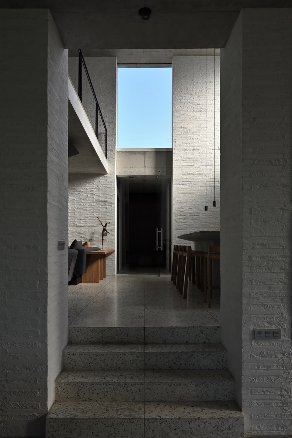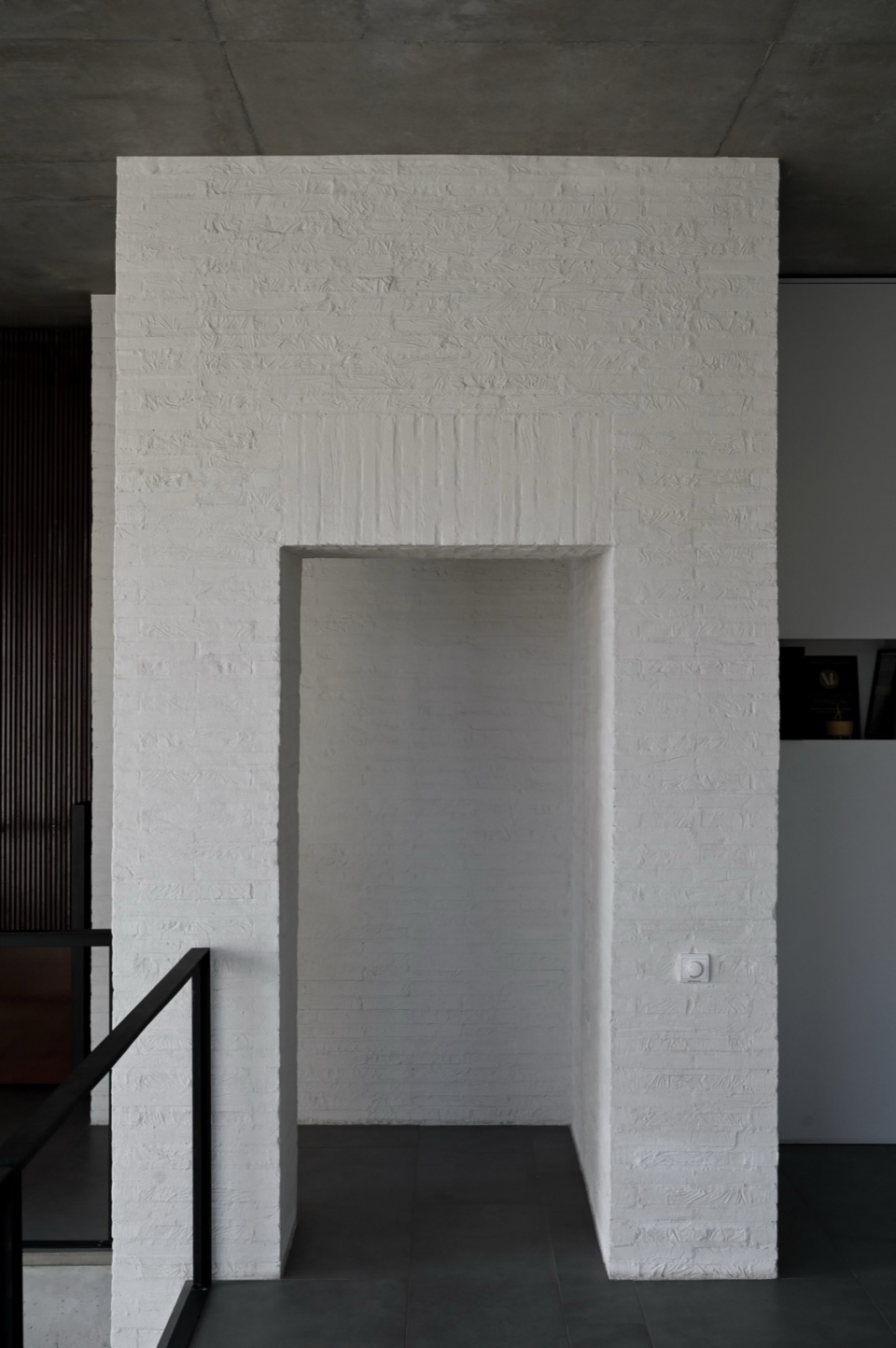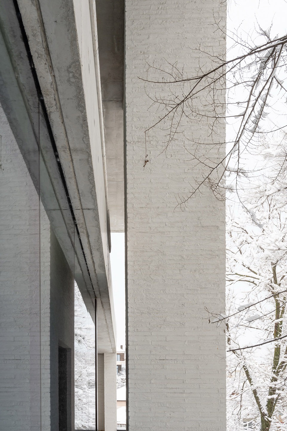 因此,在建筑的内外部,设计统一采用自行研发的白色混凝土砖纹理,并以浅色混凝土水平带加以整合,强化空间的整体性与雕塑感,使墙体与楼板呈现出一种近乎整体浇筑般的单一体量感。基地地形条件较为复杂,我们据此调整建筑朝向,将主要工作空间尽可能抬升至更高位置,以获得最佳的视野条件。