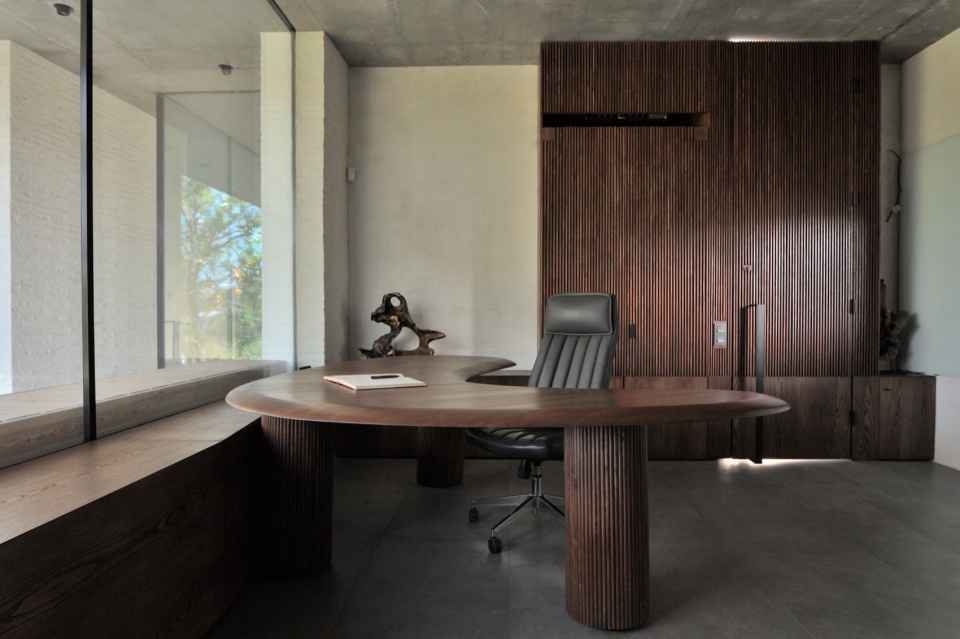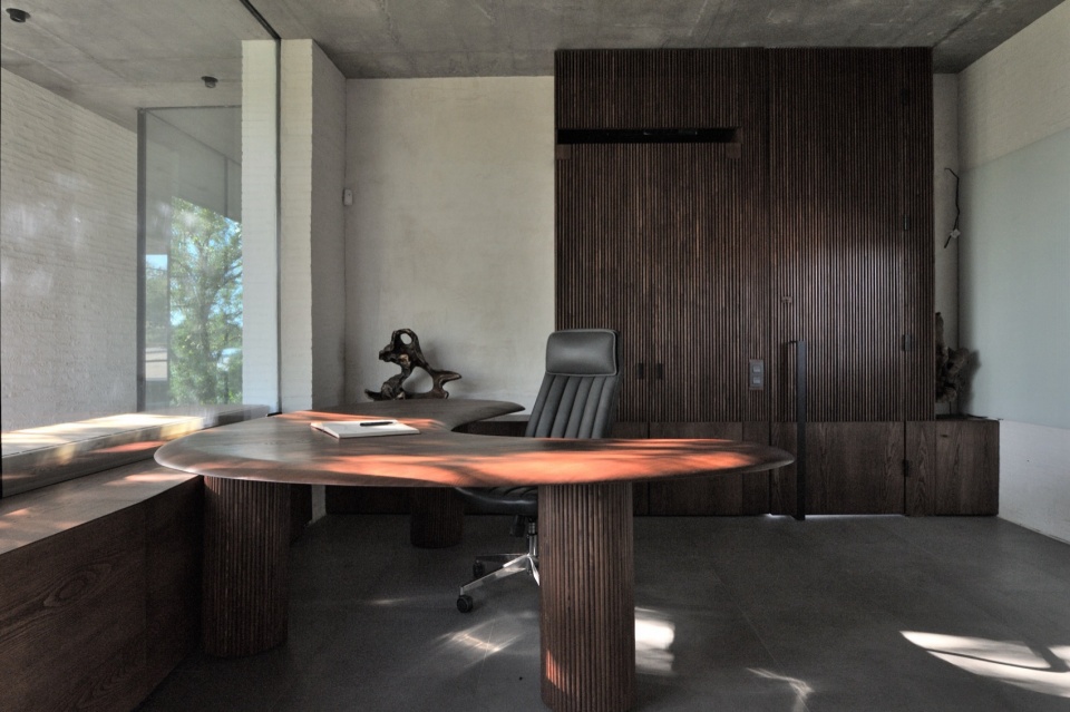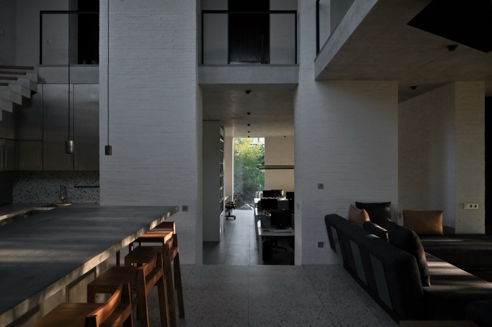 The architecture of the office is calm and monumental. It gives the sensation of reliability, durability, and protection from all exterior effects. That is exactly how feels the person, who is wrapped up in the creative work. We treat the material respectfully and strive to limit ourselves in using the textures.