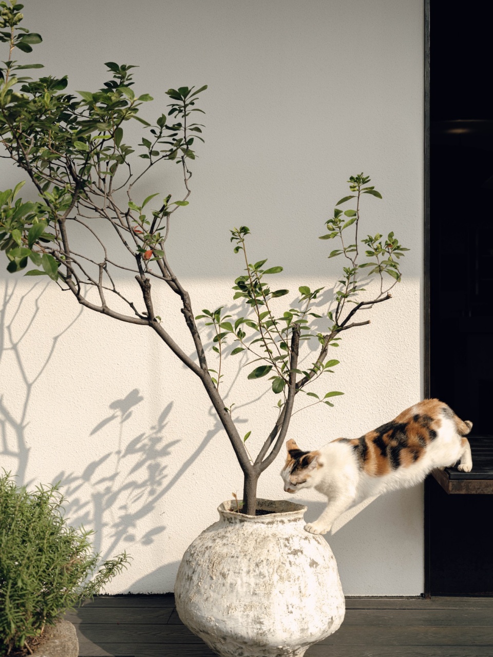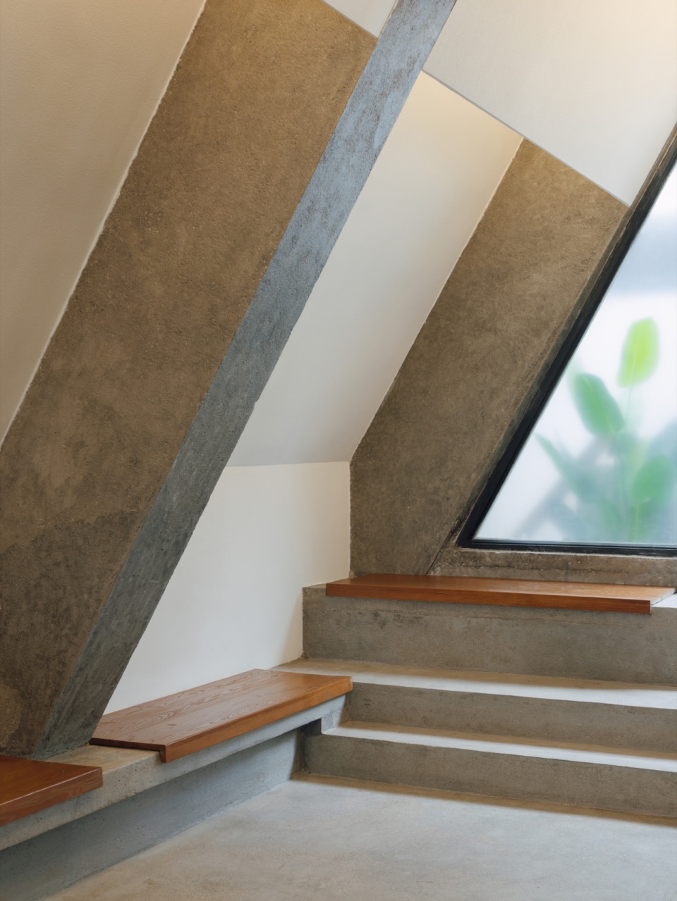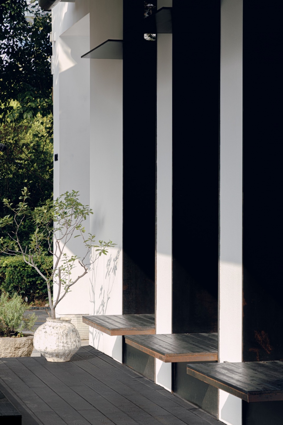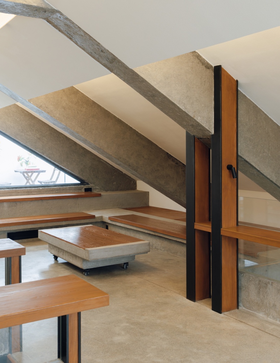 The original openings on the ground floor were preserved and adapted into an interactive semi-outdoor “gray space.” During evaluation, safety hazards were identified in the building’s original mezzanine structure. Consequently, the entire second-floor slab was structurally reinforced, with the exposed U-shaped steel beams becoming a primary visual element in the ground floor space. An elevation difference existed between the building’s original equipment platform and the interior. This was transformed into a terrace by adding steps, which also cleverly house the second-floor air conditioning units and vents within the cavities beneath. This approach avoided the disruption to the original ceiling typical of conventional AC installations. The equipment platform thus became a “stray cat garden,” a corner for the manager to briefly retreat from work.