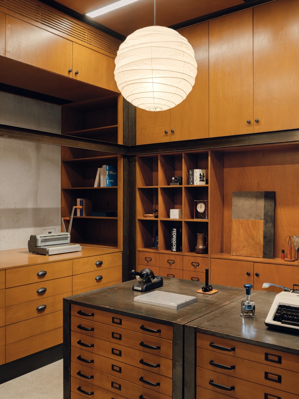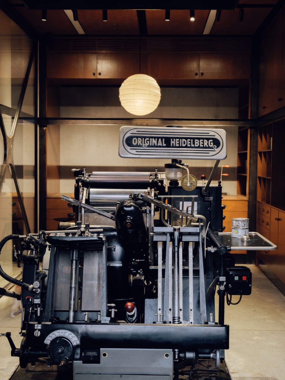 The ground floor is naturally divided into two zones. To the right of the entrance is the professional printing operation area, comprising an old Heidelberg printing press, a paper sample display, and a storage system. This area fully replicates the printing process and working environment for professional consultation and operation. To the left, a counter combines the functions of reception, light refreshments, and derivative product sales, serving as the primary public interface. A long table in the center of the space extends into an outdoor seating area, forming a naturally congregating “urban living room” for visitors, neighbors, and the team.
