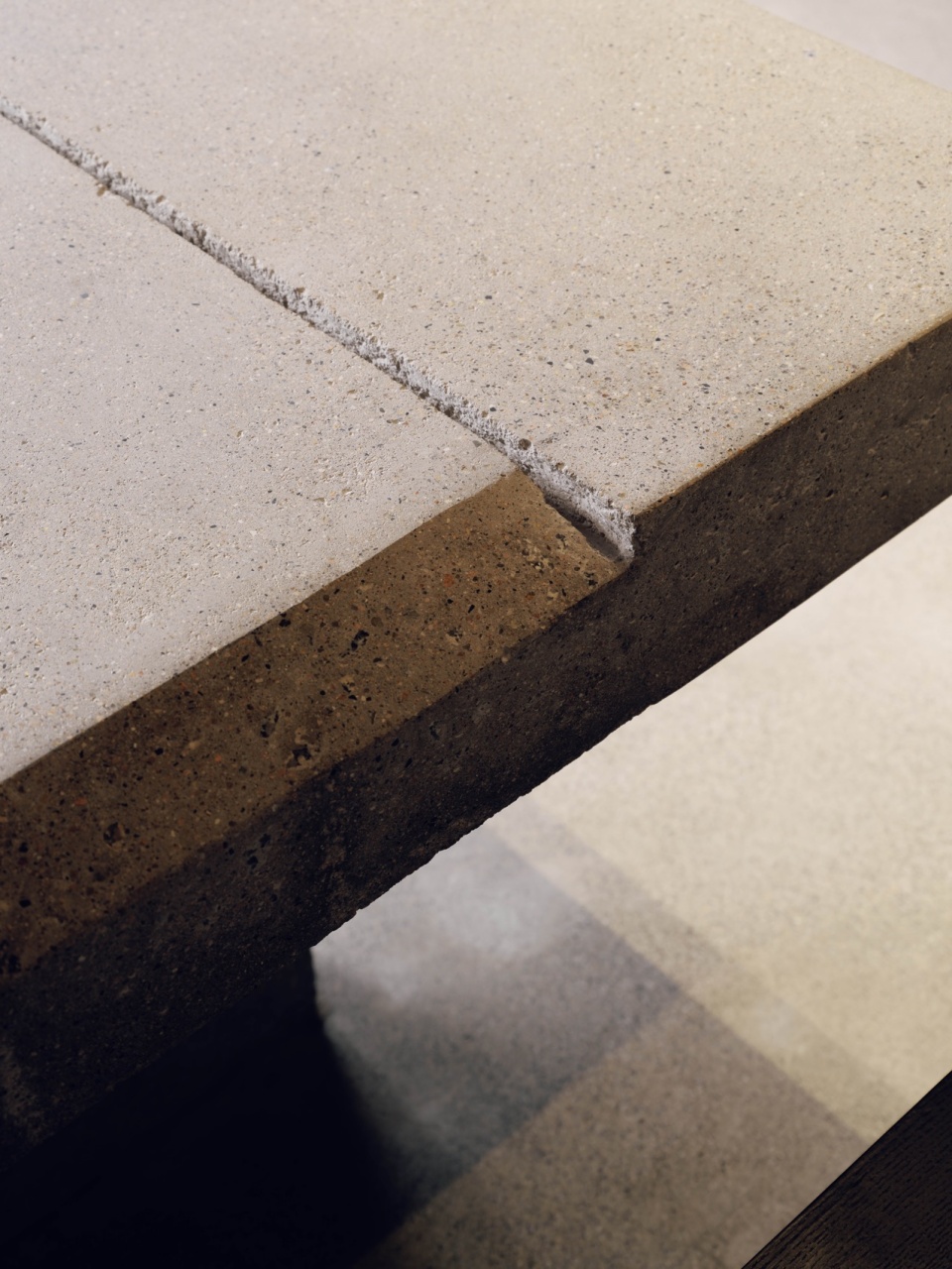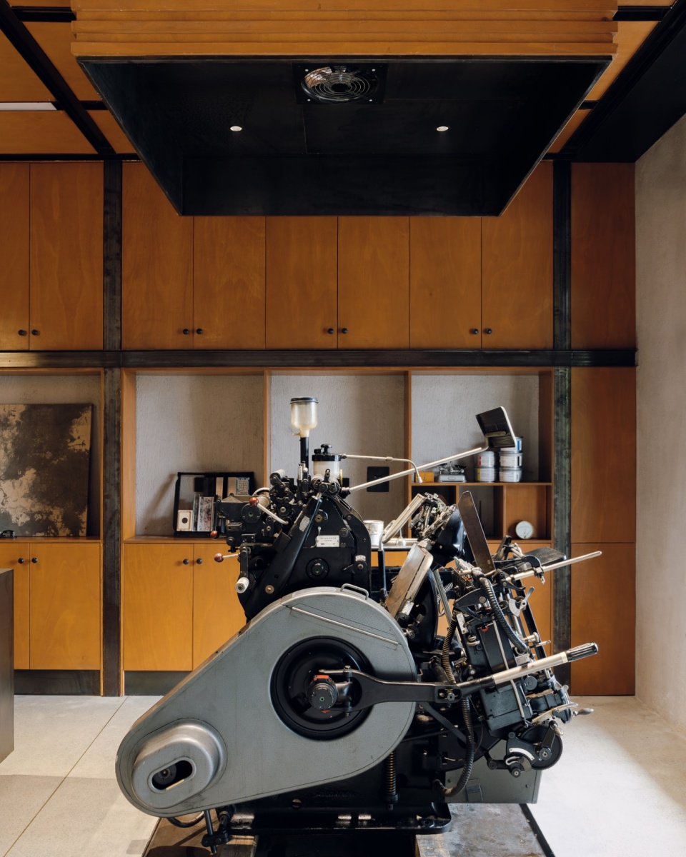 The material strategy consistently emphasizes a “handcrafted feel.” The counter was cast in concrete using small wooden formwork, retaining the texture of the molds—a metaphor for the printing process of “plate-making and pressing.” The flooring utilizes cement and carborundum, reinforcing the industrial character and construction traces. Minor imperfections from the construction process were preserved and refined. The intention is to retain the tactile quality of “imperfect authenticity,” encouraging users to rediscover the reassurance and warmth inherent in handcraftsmanship through these subtle variations.
