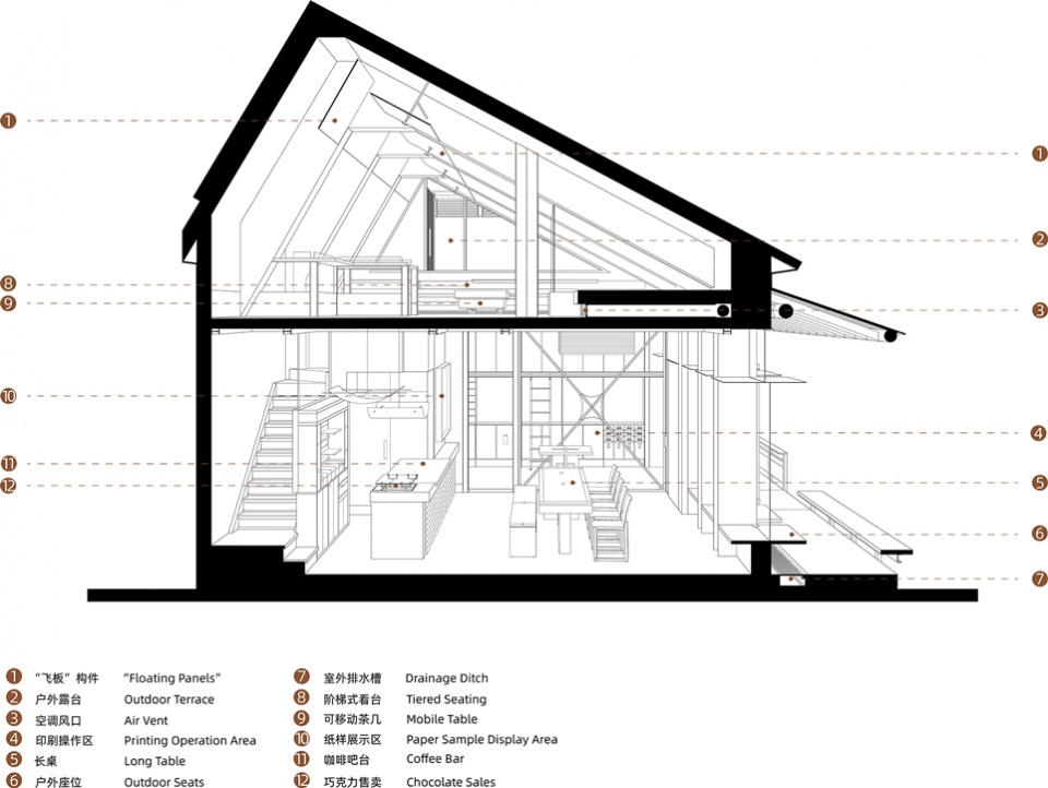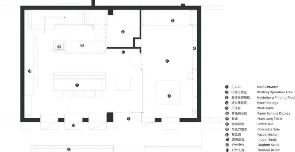 一层平面自然划分为两个区域:入口右侧为专业印刷操作区,由老式海德堡印刷机、纸样展示与存储系统构成,完整还原印刷流程与使用环境,供专业人士咨询与操作;左侧设置吧台,融合接待、轻饮与衍生品售卖功能,作为面向公众的主要界面。空间中央设置长桌,并延伸至可就坐的外摆区域,在访客、邻里与团队之间,形成一个自然聚合的“城市客厅”。