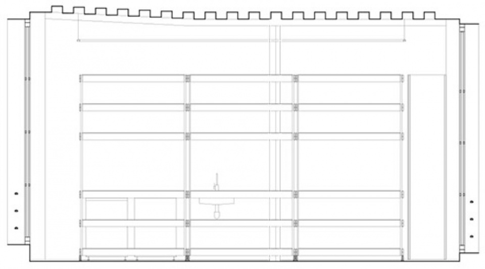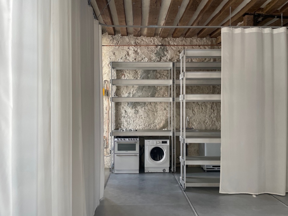 其中一部分为固定家具,用于容纳厨房与折叠床。