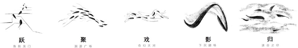 The concept of migration runs through the whole design. Following the migration direction of fish groups, visitors enter the Youli Block. At the entrance stands the “Fish Leaping over the Dragon Gate” landscape installation, with the “fish tails” leaping from the ground into the air, just like fish groups leaping out of the water and rippling waves spreading out. The shell treasures at the bottom of the river are faintly visible in the water.