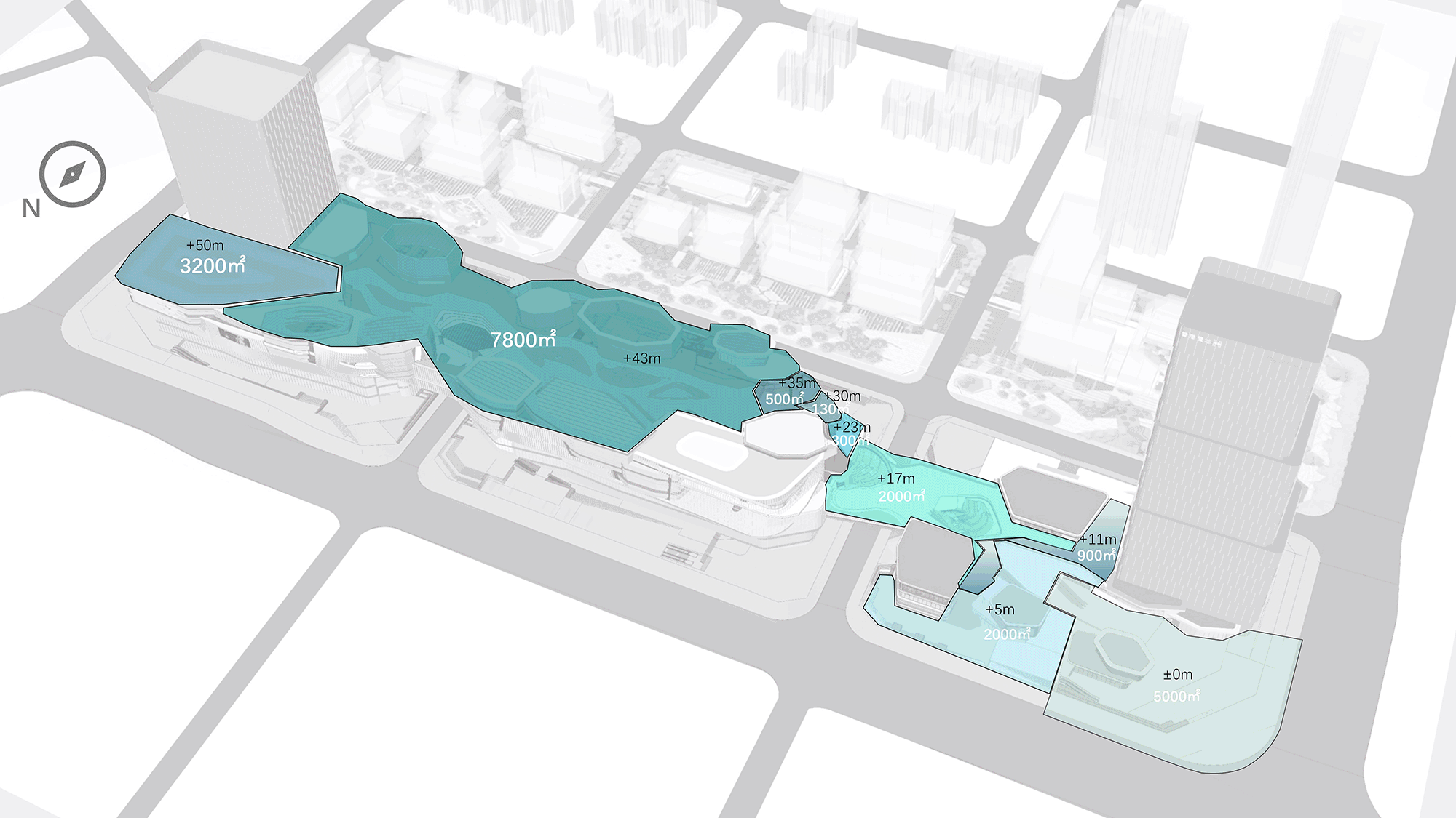 The site is divided into three functional zones: “Wander”, “Play” and “View”.Wander: A “Fantasy Valley” forms the core axis landscape, including the Migration Theater, Valley Exploration and Fantasy Sky River, making visitors feel as if wandering in a vertical valley growing upward.Play: The northern park serves as a link connecting the commercial complex and the surrounding sites. It features a variety of business formats: urban camping, a large event lawn and an outdoor theme amusement space, acting as the commercial back garden to activate the surrounding plots for the commercial complex.View: Facing Tongmao Avenue to the south, this area is an important display facade of the commercial complex. It is necessary to sort out the unfavorable points of the urban facade, avoid emphasizing excessive stay, and the landscape intervention is designed in a relaxed and natural way.