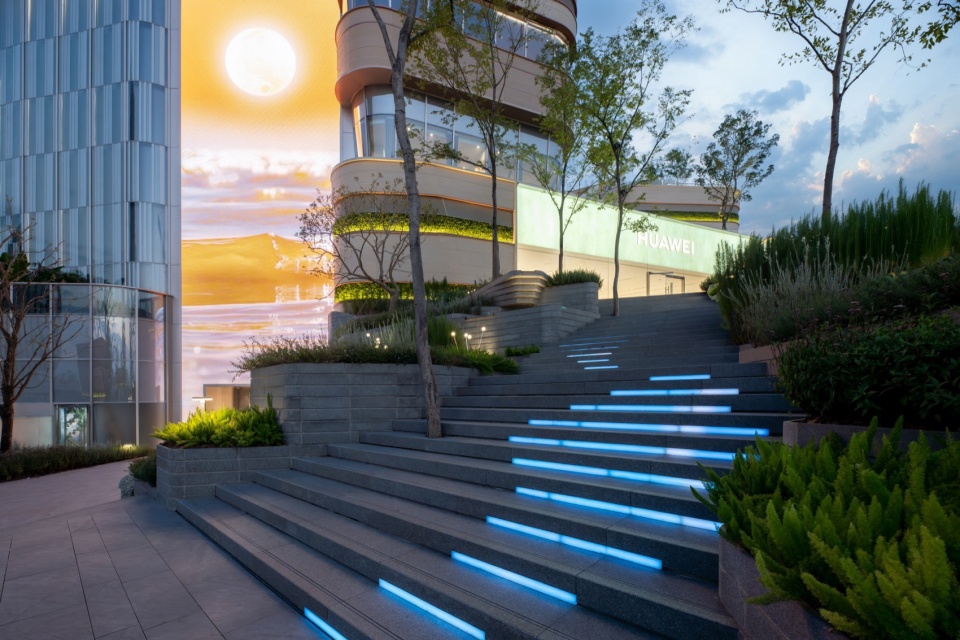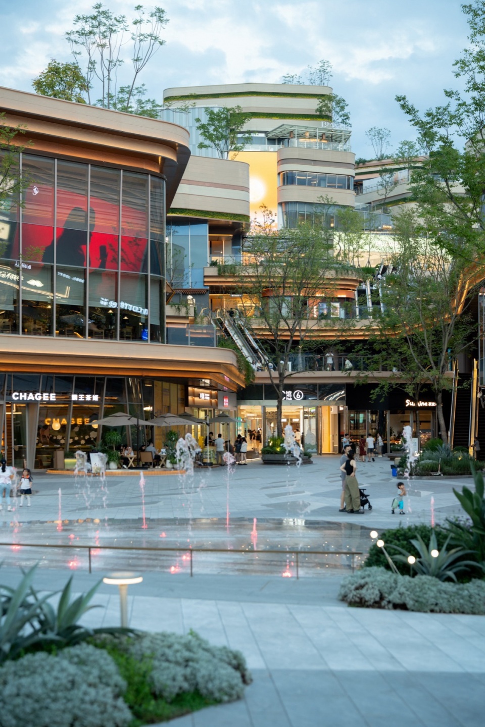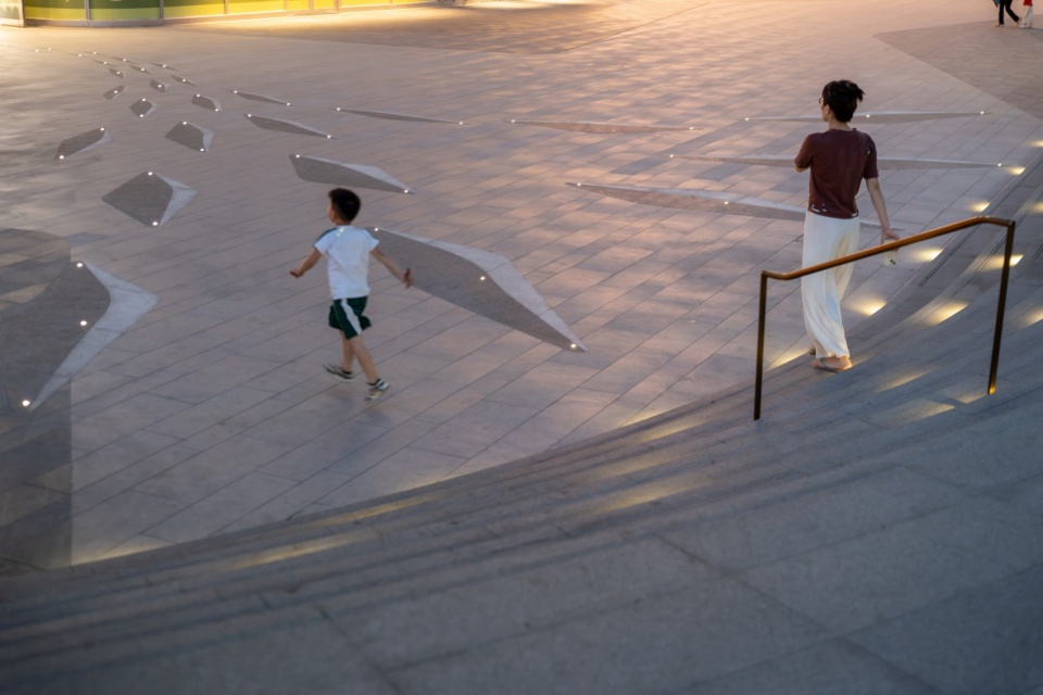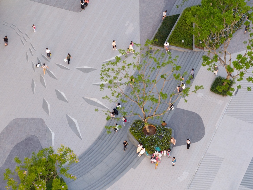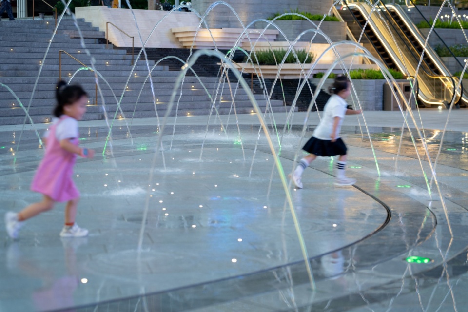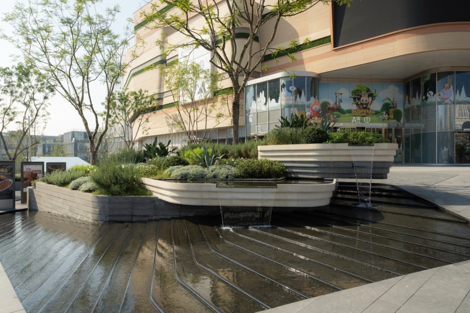 Walking forward along the stepped waterscape, the cascading waterfalls flow slowly down the flower bed facades, and the dry spray square dancing to the music together form a vivid spatial picture. The centripetal steps skillfully transform the height difference into a cohesive theater space, taking into account the demand for diverse activity spaces for commercial operation in advance.
