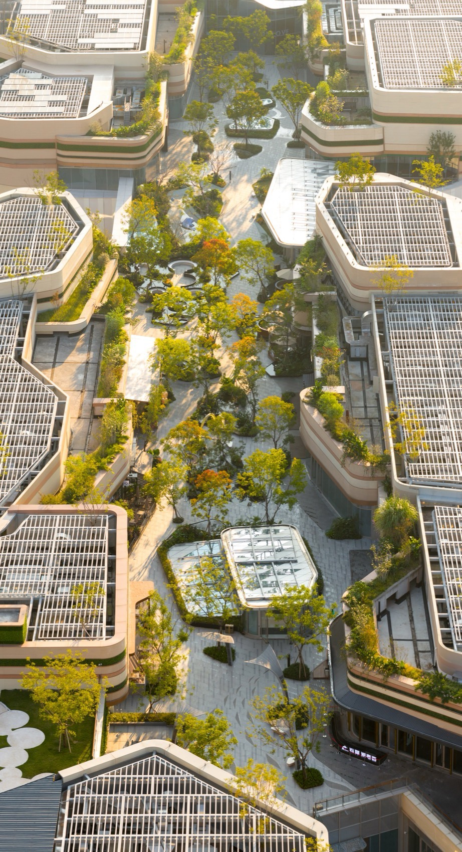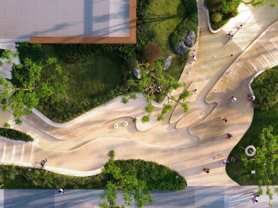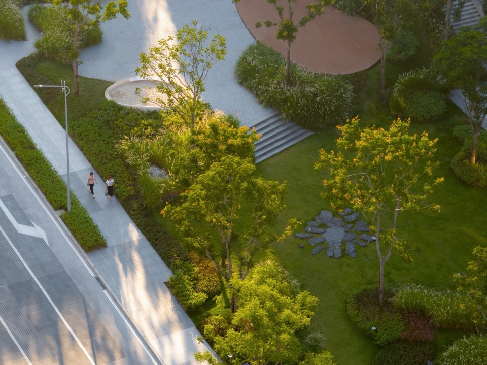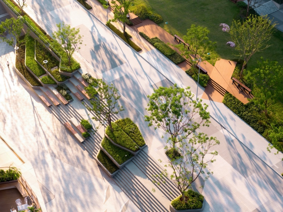 乔木选择了纤细的造型树,有的成群,有的从建筑屋顶生长出,有的从立面斜飘出来。结合低维护灌木,让视线变得通透有层次,也增加密林感受,由此形成可漫步、停留的立体绿洲。