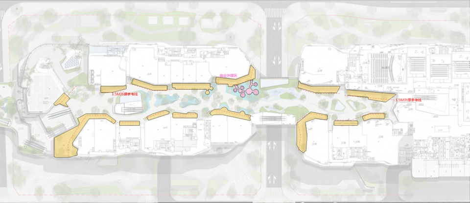 为了加强地块之间的联动,我们前期与业主和交通顾问共创,通过巧妙的车行动线优化,避让开了两条市政道路,借助市政道路空间,打造成集市街,从而更有效的将商业与公园相连。丰富商业游逛体验,也满足后期运营所需,让商业与公园相互渗透。
