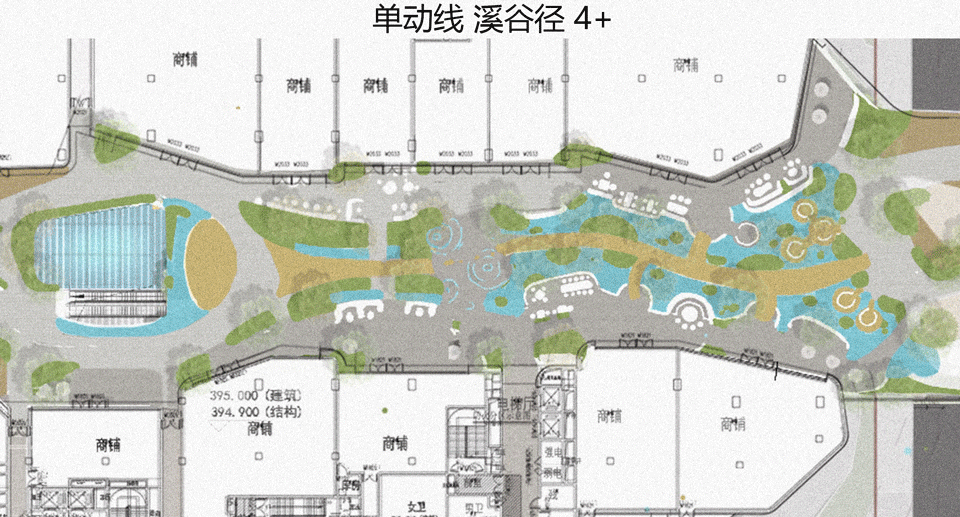 ▼景观在公区和店铺私享外摆区形成不同尺度的圆形下沉式水中包厢,The landscape creates circular, sunken water compartments of different sizes in the public area and the private outdoor seating area for the shops