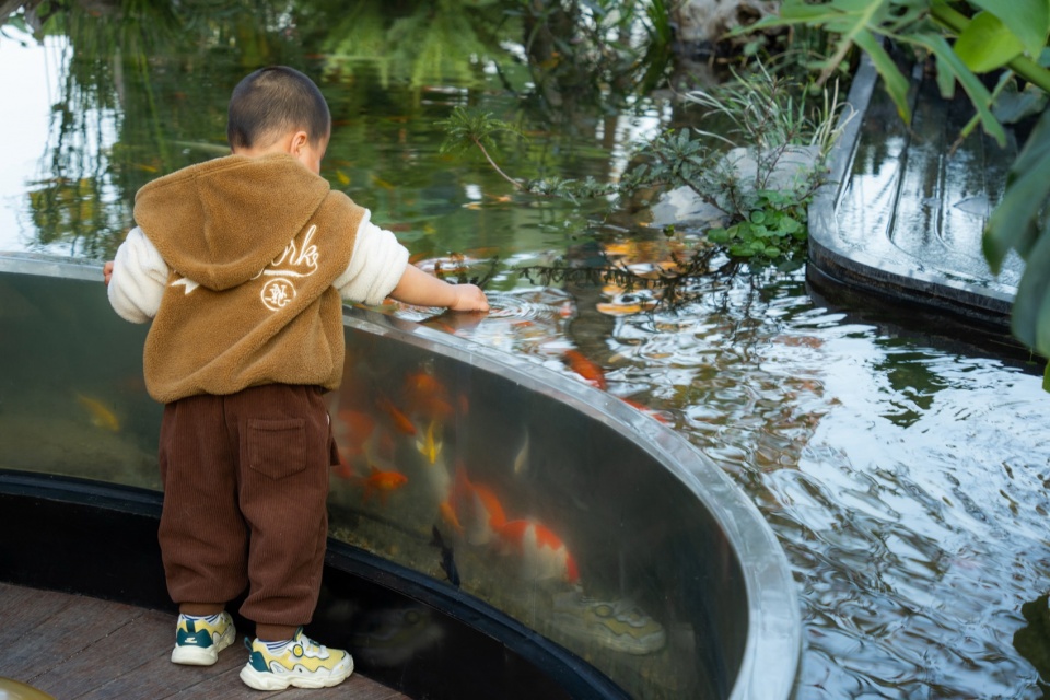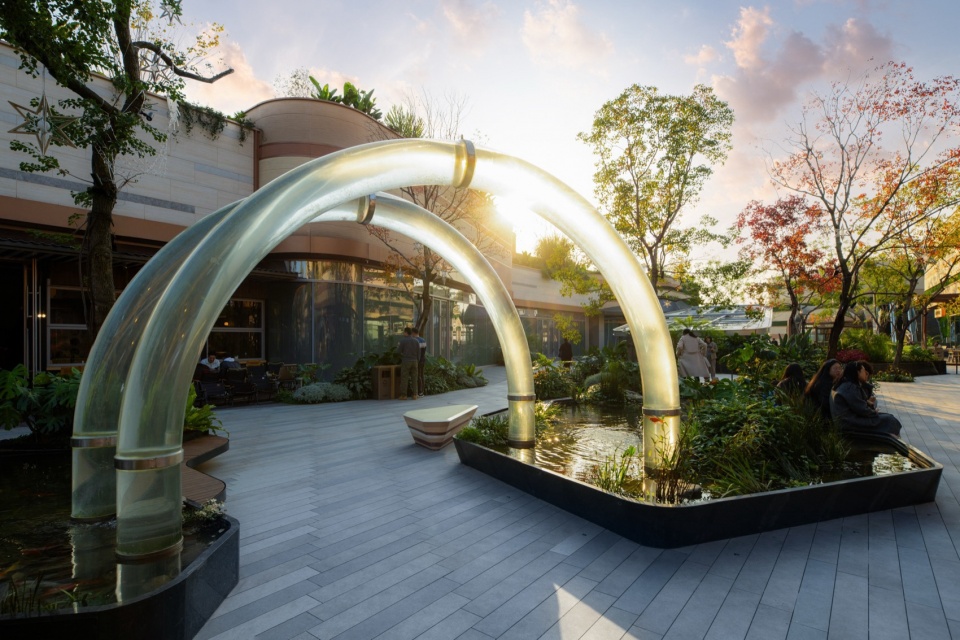 Between the ecological fish tanks, there is also an interesting “Fish Leaping over the Dragon Gate” installation. A curved acrylic negative pressure pipeline with a length of 6 meters and a height of 2.5 meters allows small fish to escape from the fish tank to the sky or fly to another pool. To verify the feasibility of the pipeline and whether the fish groups will really swim upward along the pipeline, the designers conducted a preliminary test with a small-area ecological fish tank installation in the early stage. The fish groups formed a habit within 5 days after the installation was completed, and can be attracted to enter the pipeline by feeding or tapping every time.