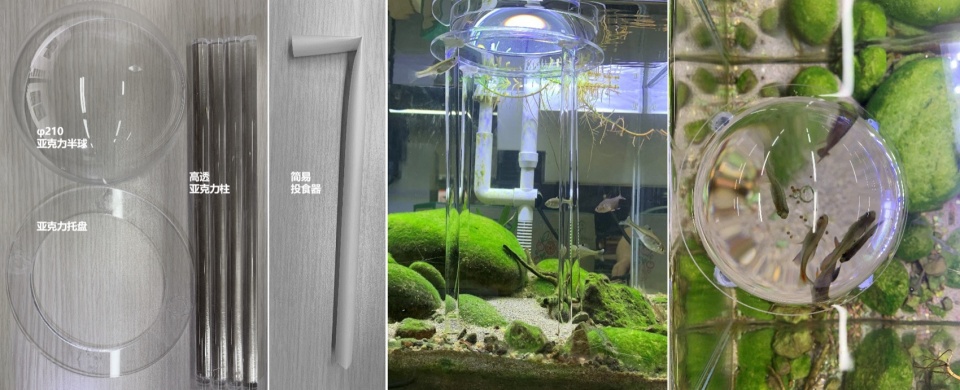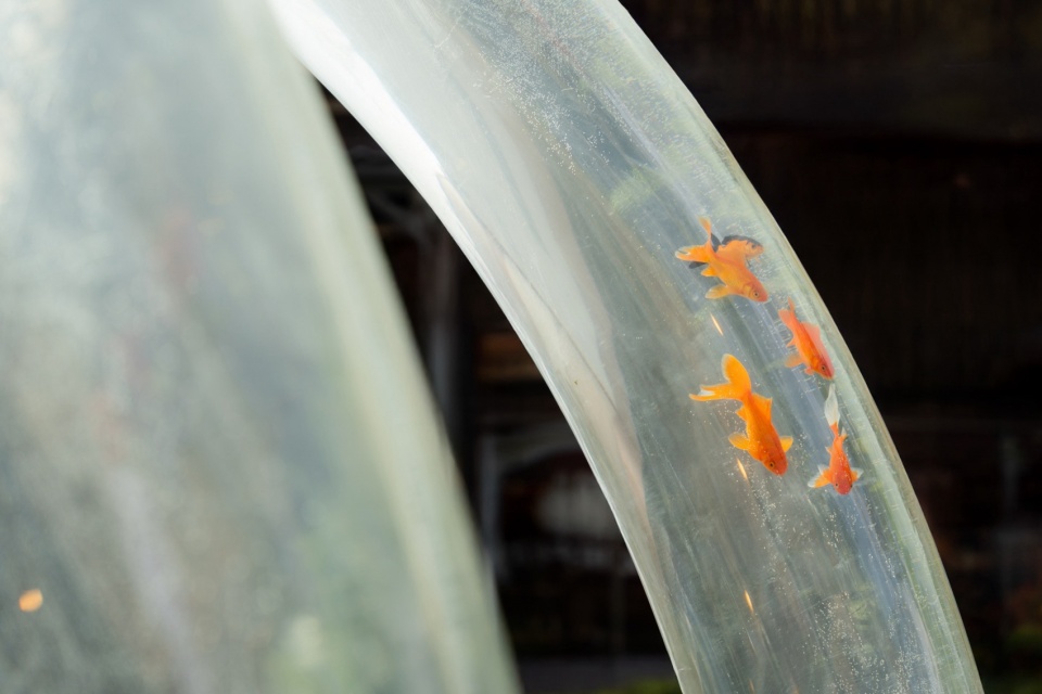 在生态鱼缸之间,还有个“鱼跃龙门”趣味装置。一条长6米、高2.5米的曲形亚克力负压管道,小鱼可以摆脱鱼缸飞向天空,也可以飞向另一个水池。为了验证管道的可行性和鱼群是否真的会沿着管道向上游走,设计师在前期以小面积生态鱼缸装置提前测验,装置成型5天鱼群习惯便已养成,在每次喂养或敲击即可吸引鱼群进入管道。