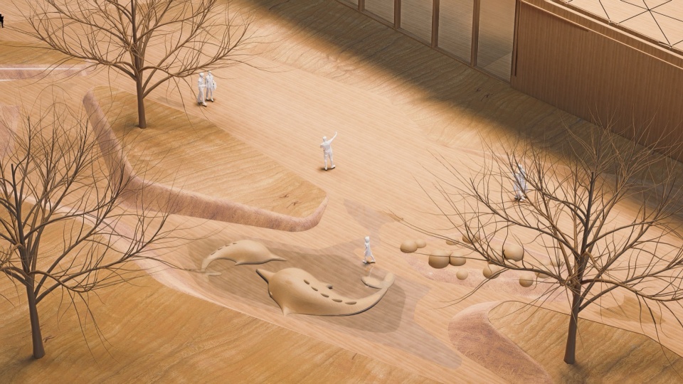 在街区中间我们考虑了一个空间节点作为鱼群洄游的“目的地”。这个场域是一个戏水空间, 希望小朋友在玩水的同时,感受到洄游的隐秘线索。