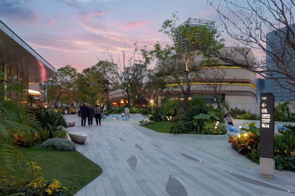 The public green space between the commercial complex and the office & residential areas is divided into three small plots by municipal roads, which is the most important link connecting the surrounding plots. We integrate the commercial complex with the public green space through landscape infiltration, open boundaries and the embedding of slow traffic systems, and drive consumption by using public space, making the park a shared link for flow guidance and experience. The three small plots are endowed with different thematic functions: a large lawn focusing on outdoor camping lifestyle, a lawn theater that can meet the needs of outdoor gathering activities and art exhibition space, and a children’s water play activity area with The Ring Garden City IP SenSen installations as the core.