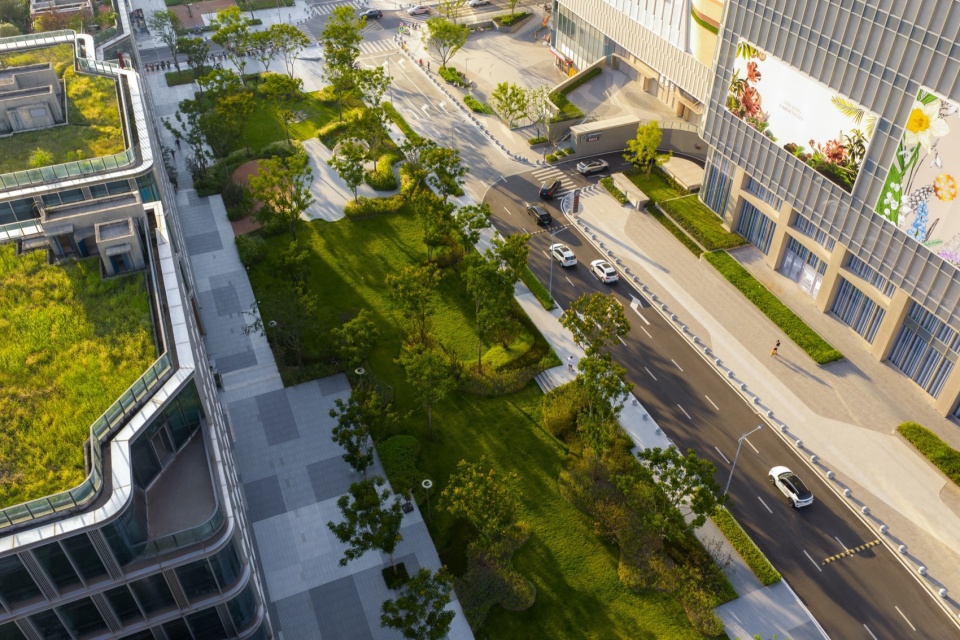 To strengthen the linkage between the plots, we co-created with the owner and traffic consultants in the early stage. Through ingenious optimization of vehicle circulation, we bypassed two municipal roads and transformed the municipal road space into a market street, thus connecting the commercial complex and the park more effectively. This enriches the commercial roaming experience, meets the needs of later operation, and realizes the mutual infiltration of the commercial complex and the park.