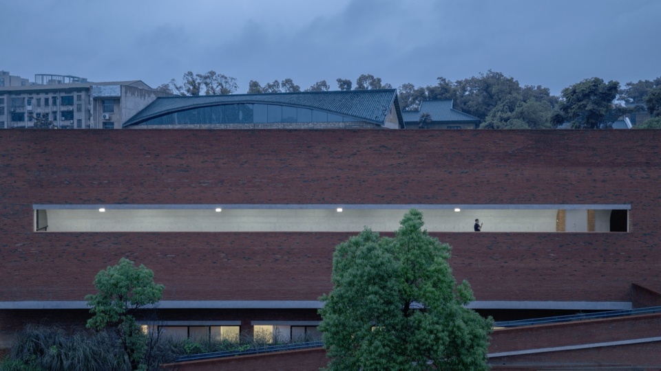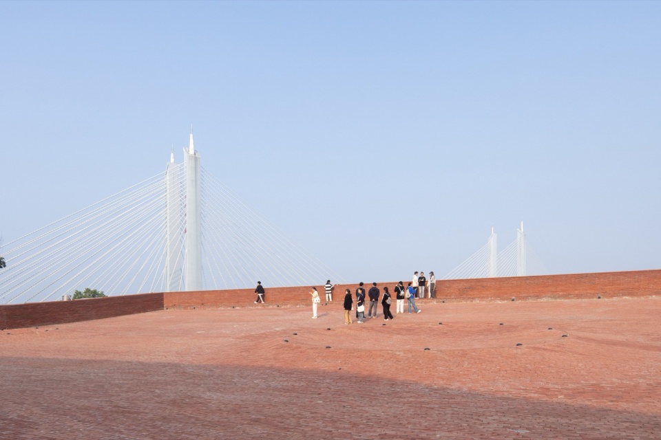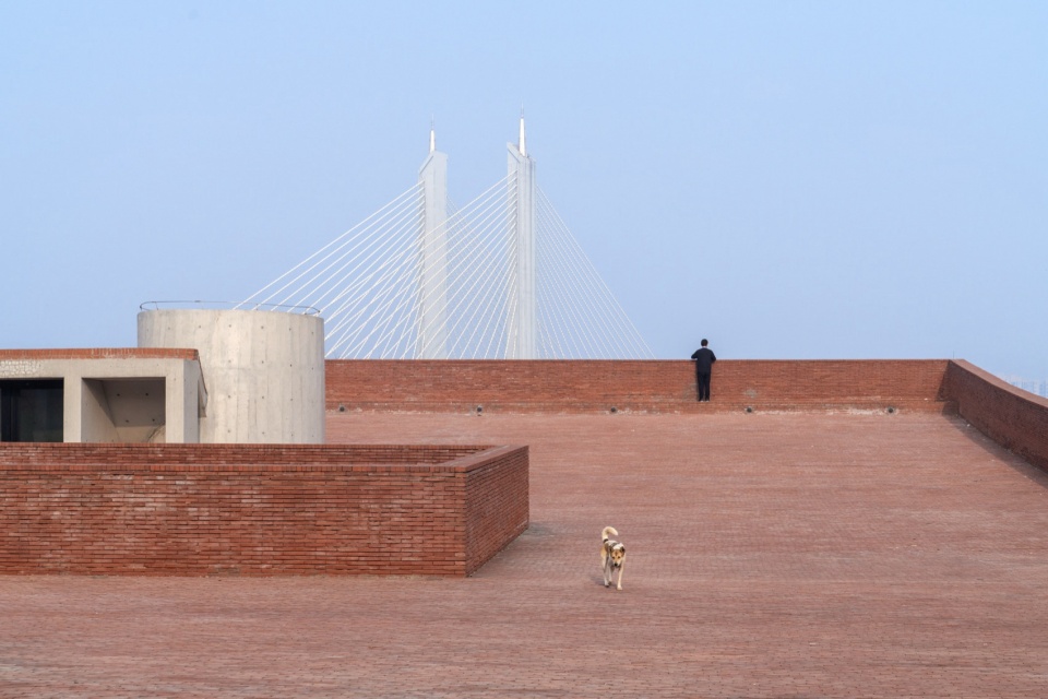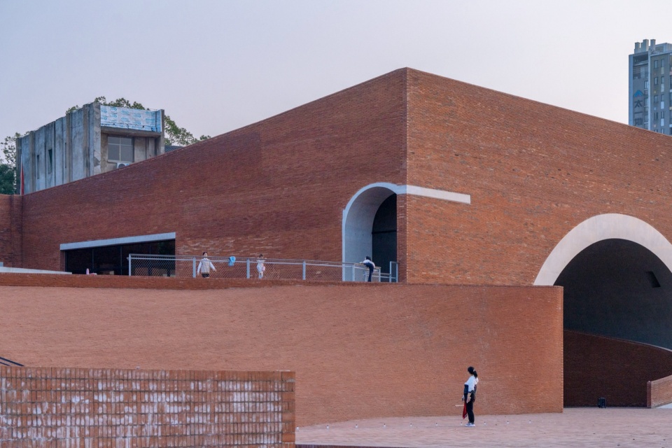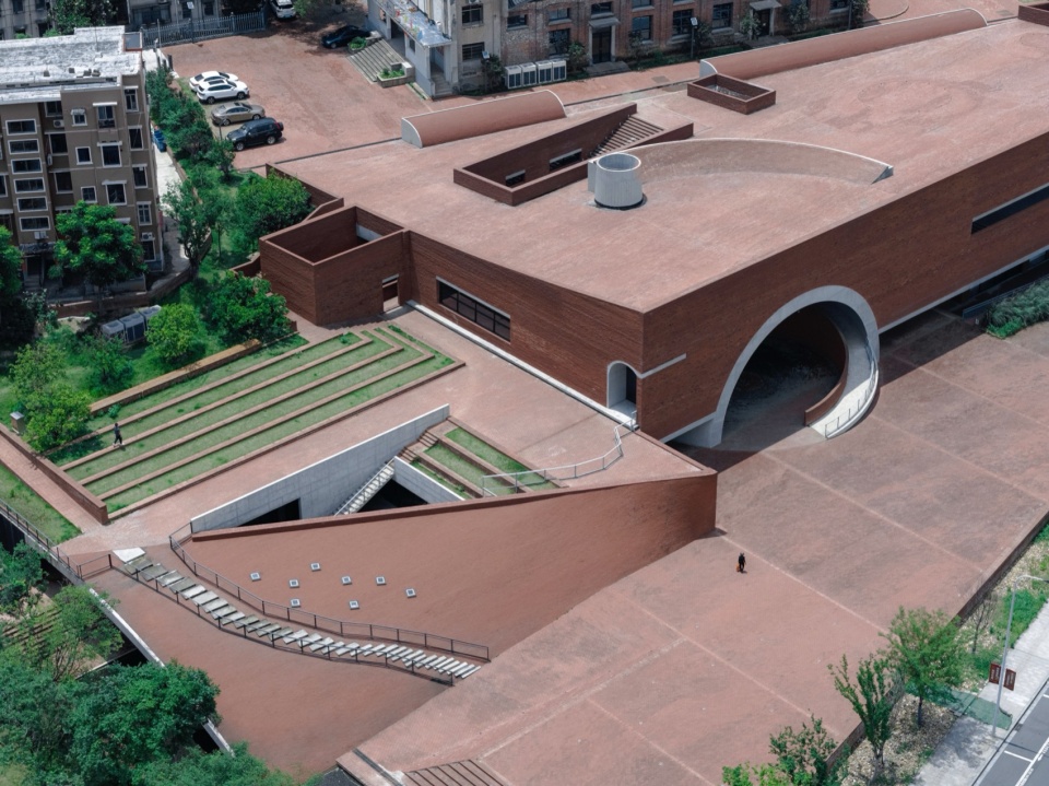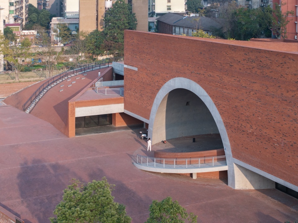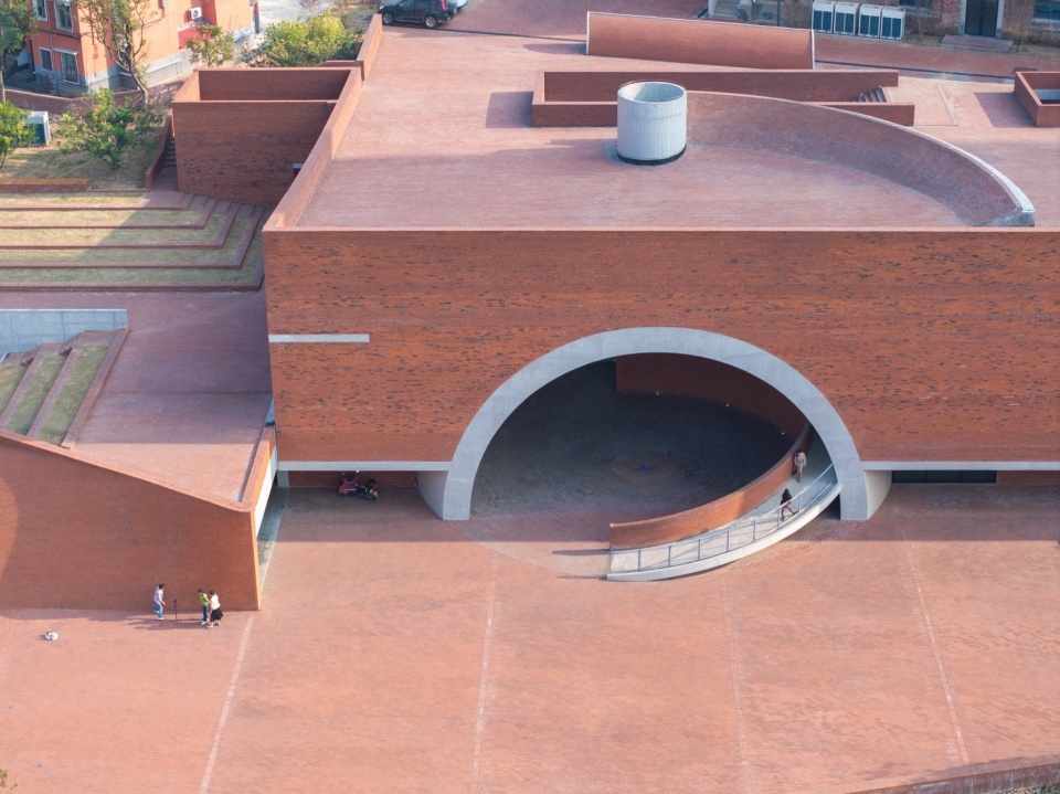 The lowest point of the roof surface aligns precisely with the historic building’s ground level on the hilltop. The gently undulating red brick paving echoes the color and texture of the hillside’s laterite soil. Scattered circular depressions break the homogeneity of the paving: they reflect the sky when it rains, and become playgrounds for children and skaters on sunny days.