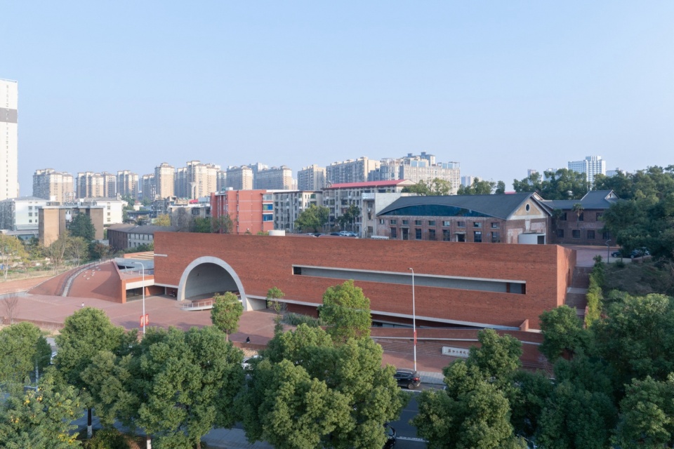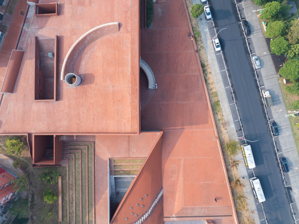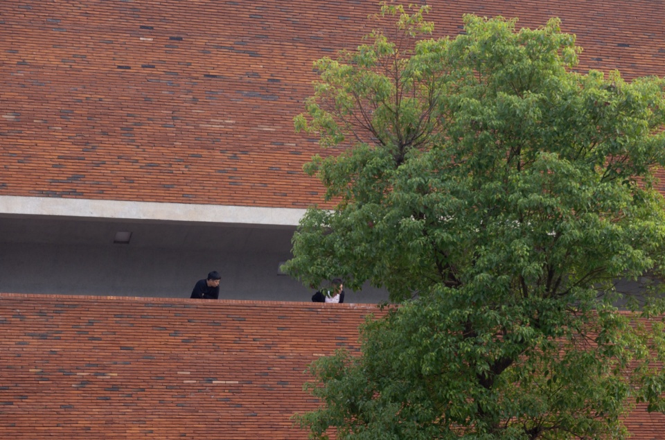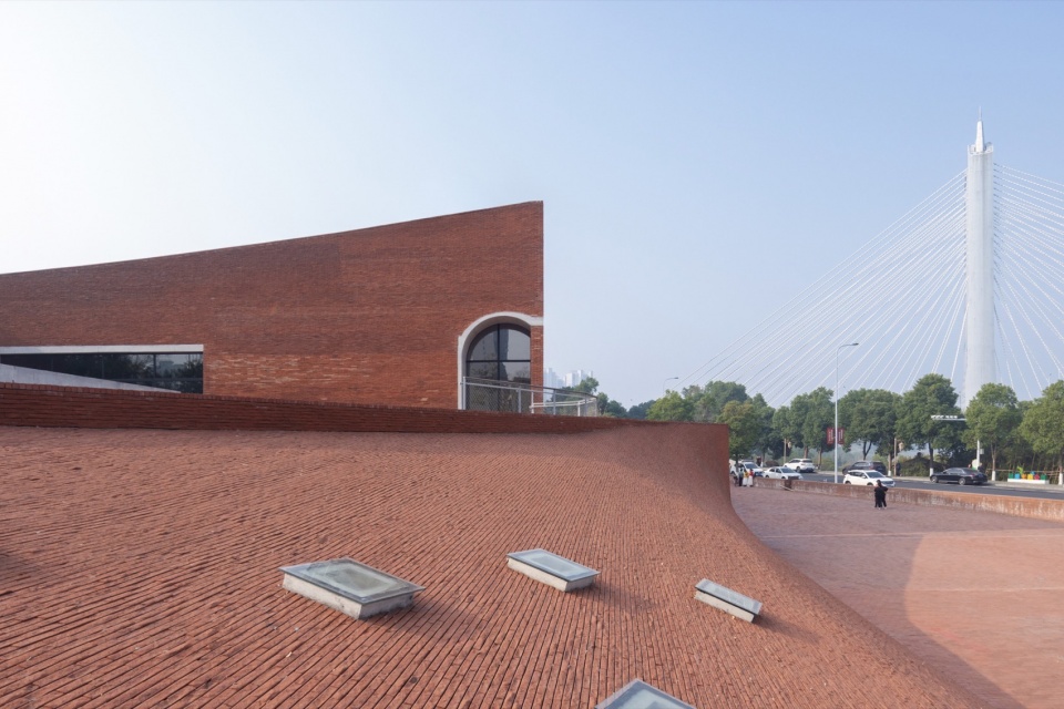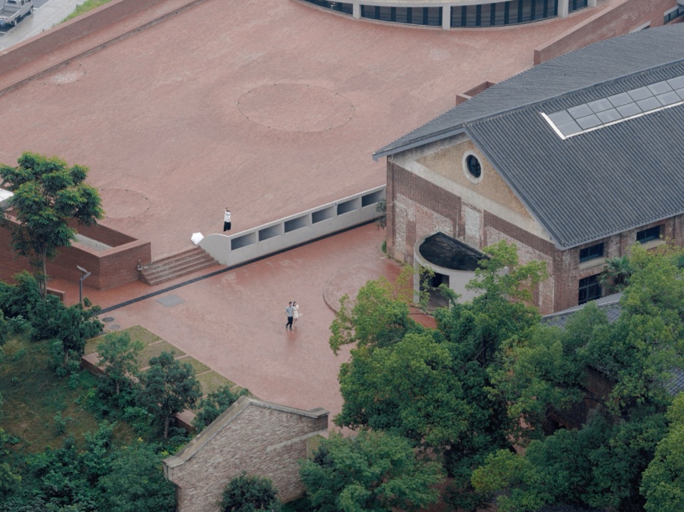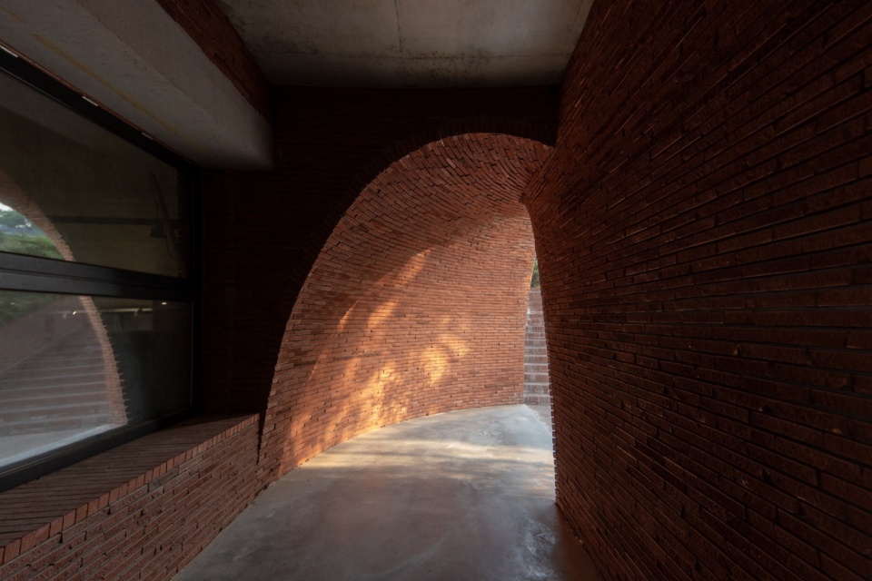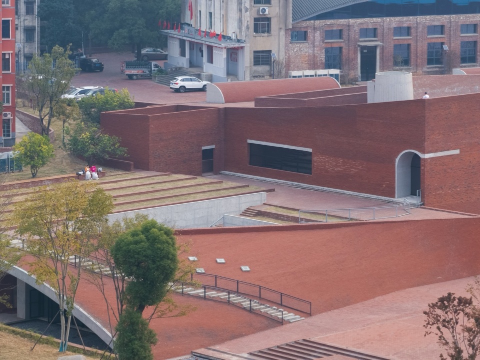 The lowest point of the roof surface aligns precisely with the historic building’s ground level on the hilltop. The gently undulating red brick paving echoes the color and texture of the hillside’s laterite soil. Scattered circular depressions break the homogeneity of the paving: they reflect the sky when it rains, and become playgrounds for children and skaters on sunny days.