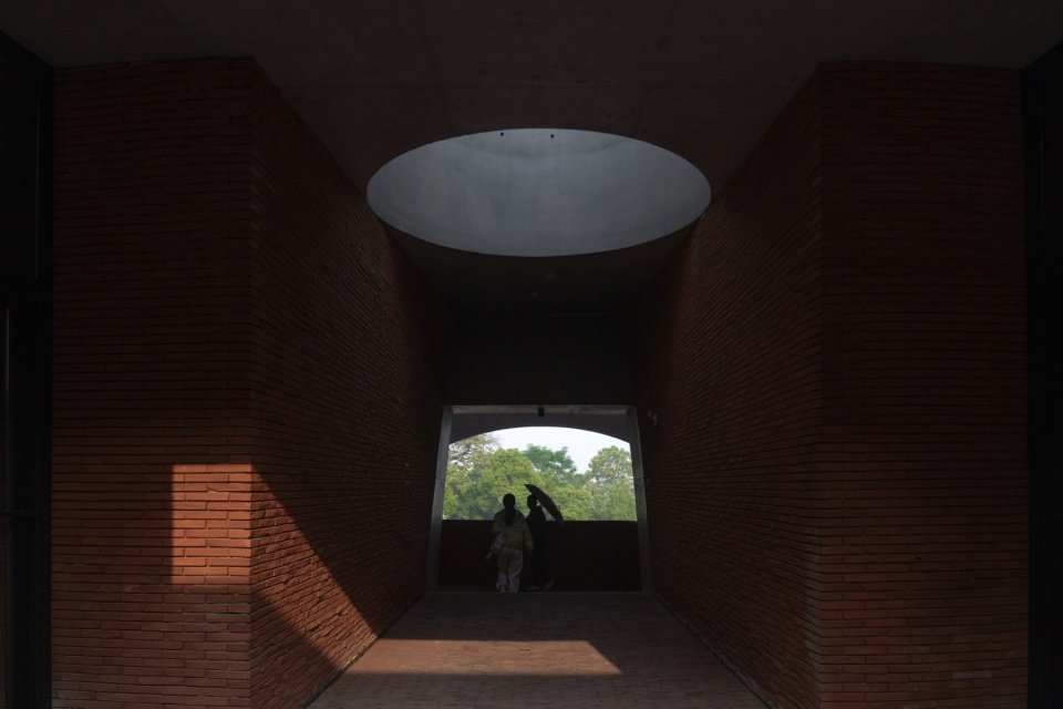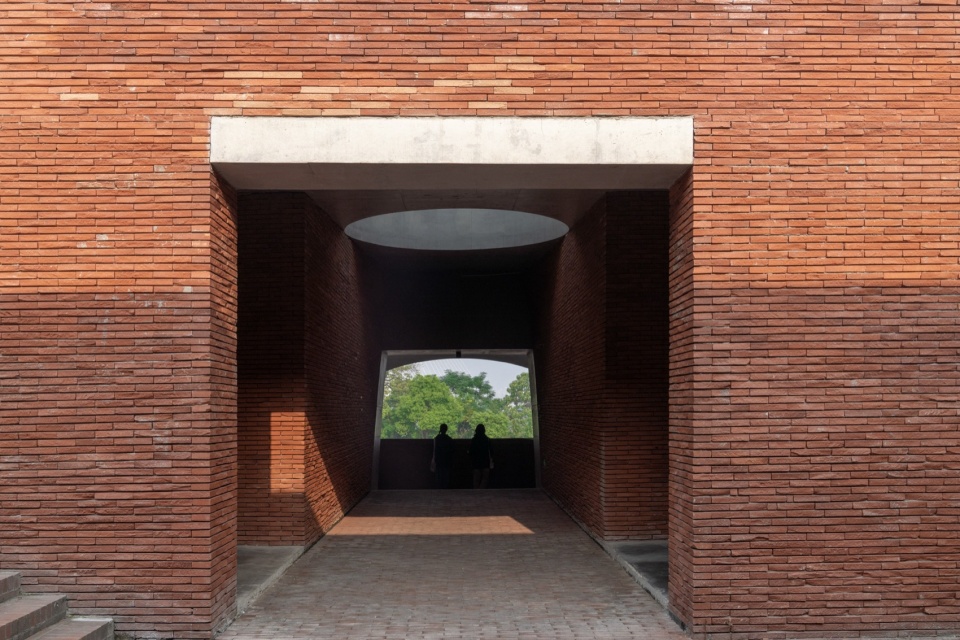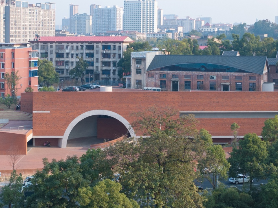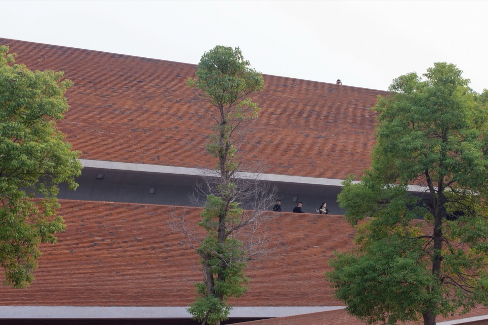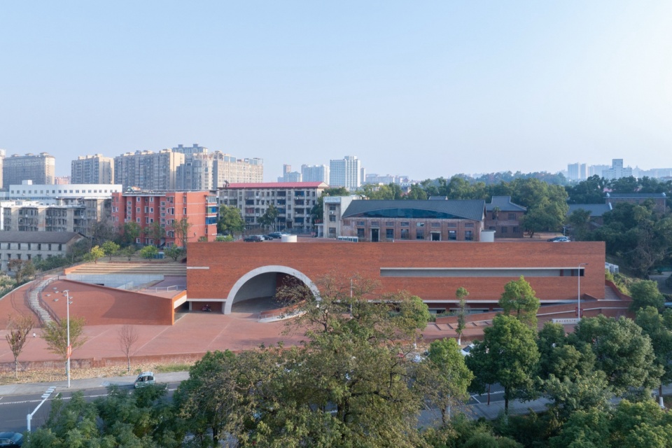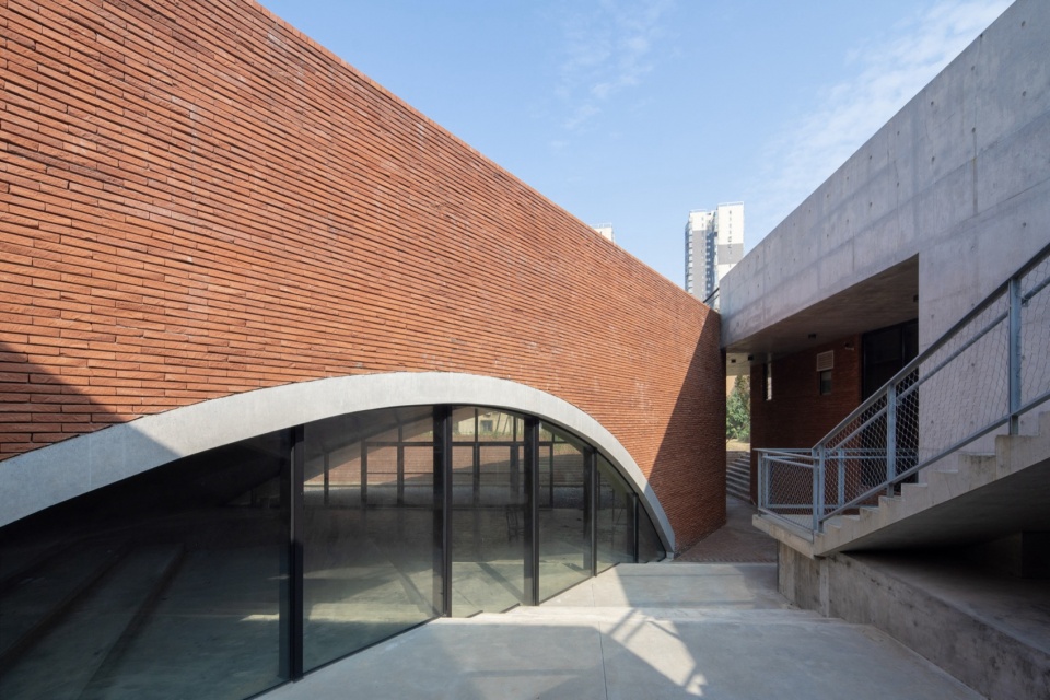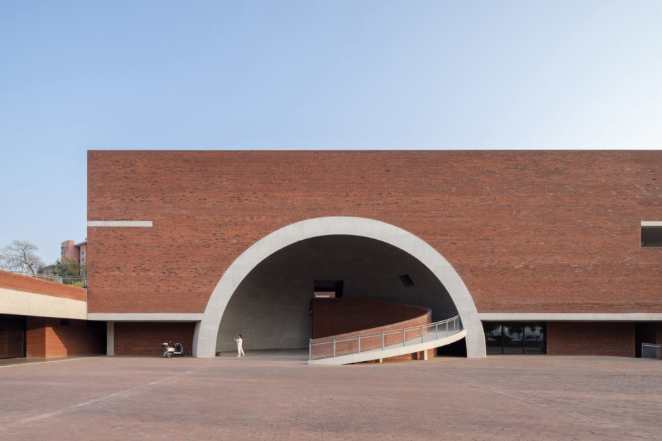 The lowest point of the roof surface aligns precisely with the historic building’s ground level on the hilltop. The gently undulating red brick paving echoes the color and texture of the hillside’s laterite soil. Scattered circular depressions break the homogeneity of the paving: they reflect the sky when it rains, and become playgrounds for children and skaters on sunny days.