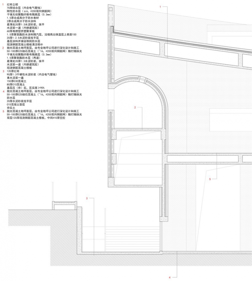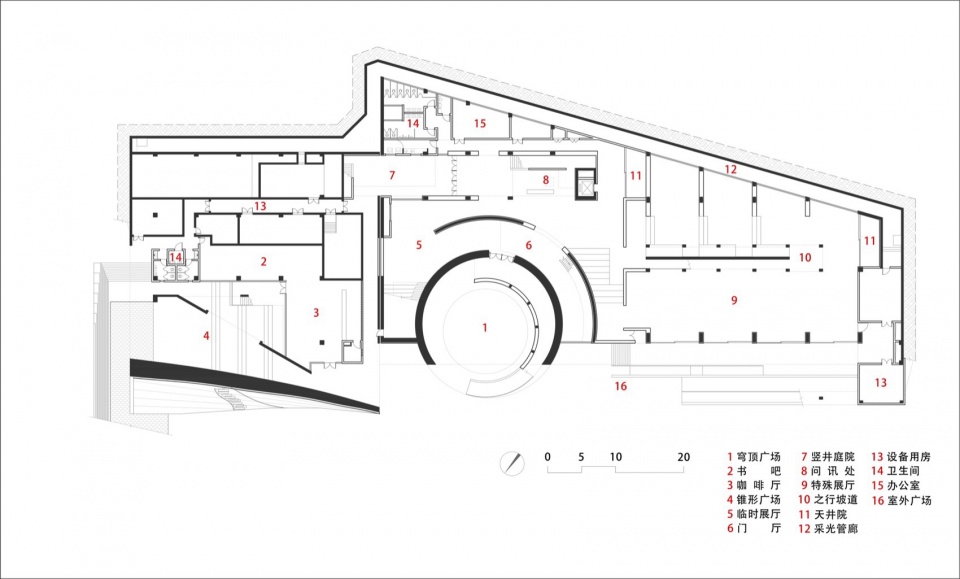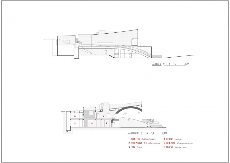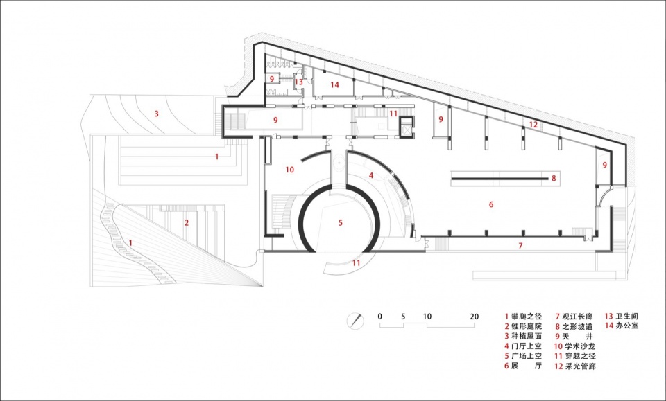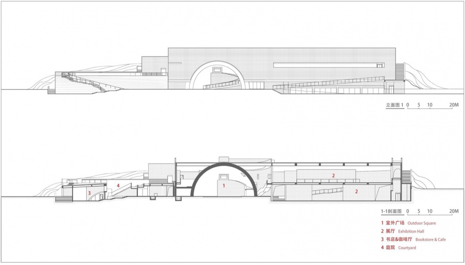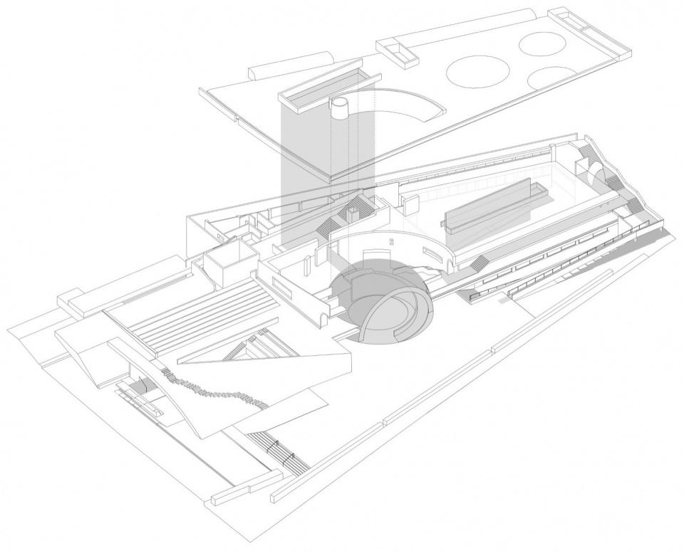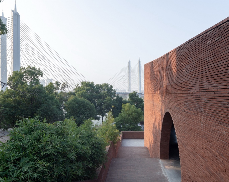 首先是“穿越之径”。嵌入山体的建筑体量横向延展,客观上削弱了城市与江岸的直接联系,设计借助穹窿空腔植入环形坡道,使行人得以在半空中穿行于建筑内部。