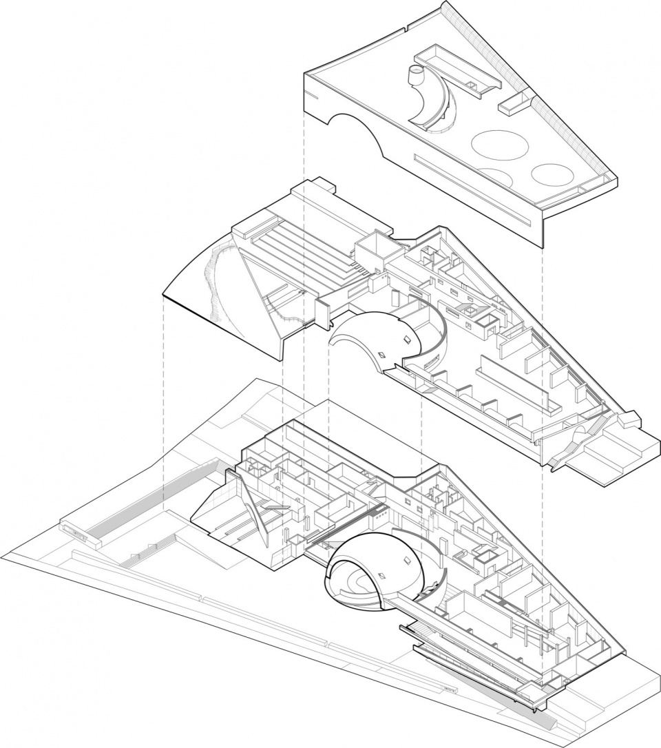 First, the Path of Transversal Penetration. The building volume embedded in the mountain extends horizontally, which would otherwise weaken the direct connection between the city and the riverfront. The design inserts a circular ramp through the domed void, allowing pedestrians to traverse the building at mid-height.