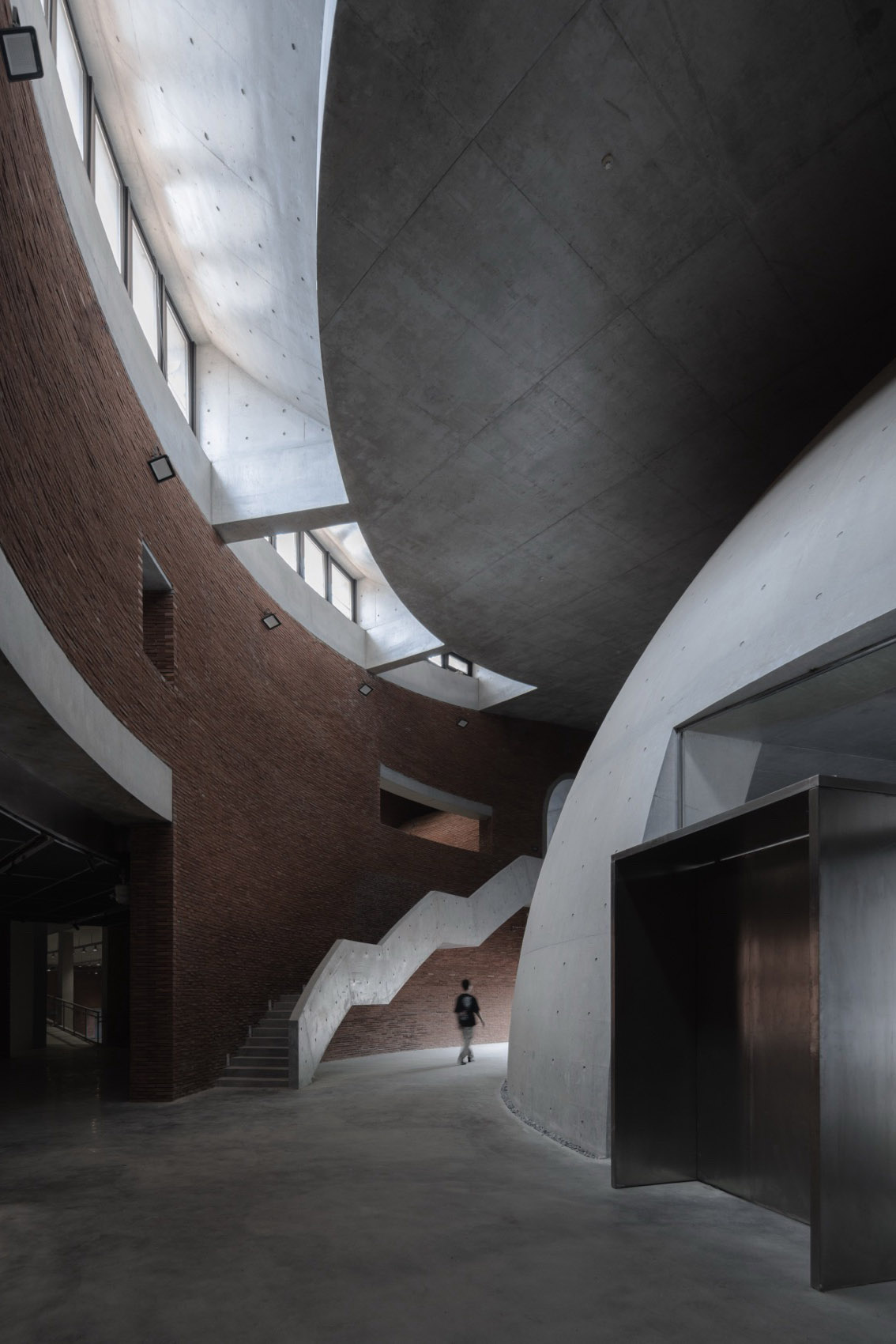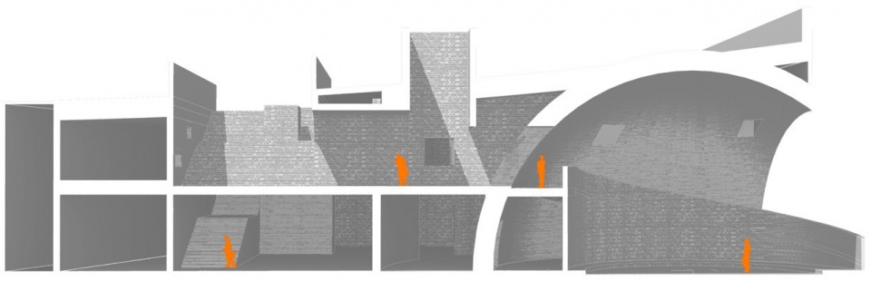 在内部空间组织上,设计以一条连续的旋转路径作为核心线索,将原本破碎、断裂的老建筑内部重新串联。旋转上升的坡道与阶梯穿插于既有砖墙与新植入的结构之间,在回旋中不断遭遇不同高度的视线关系、光影变化与历史构件,引导人在行走中完成一次由遗存走向更新的空间体验。
