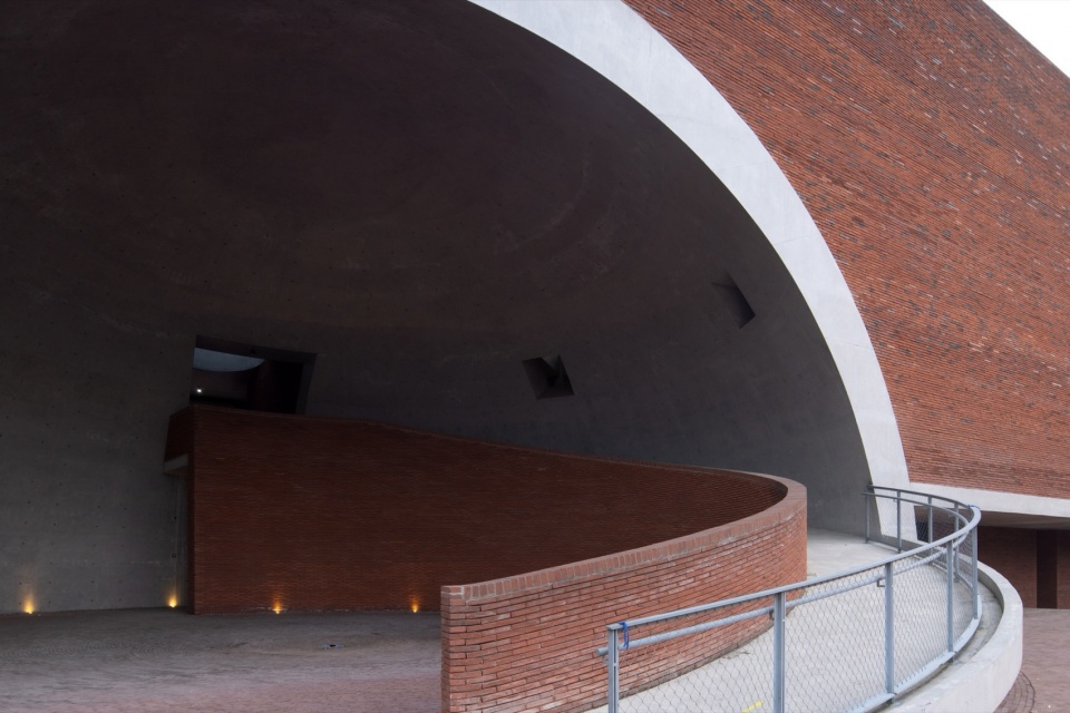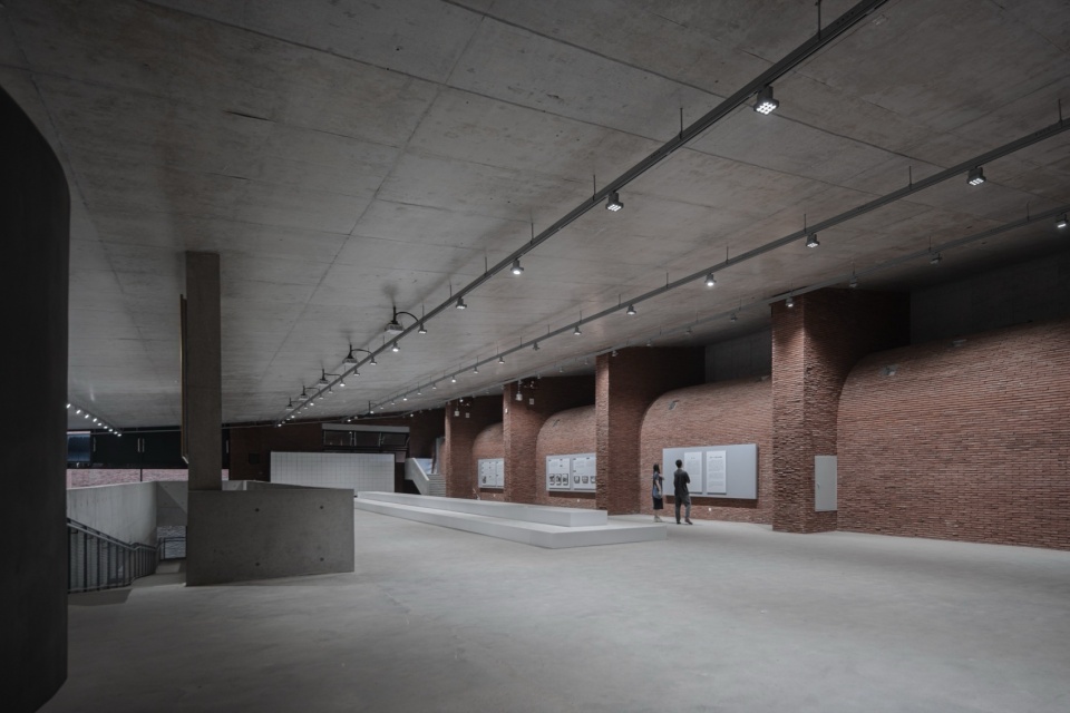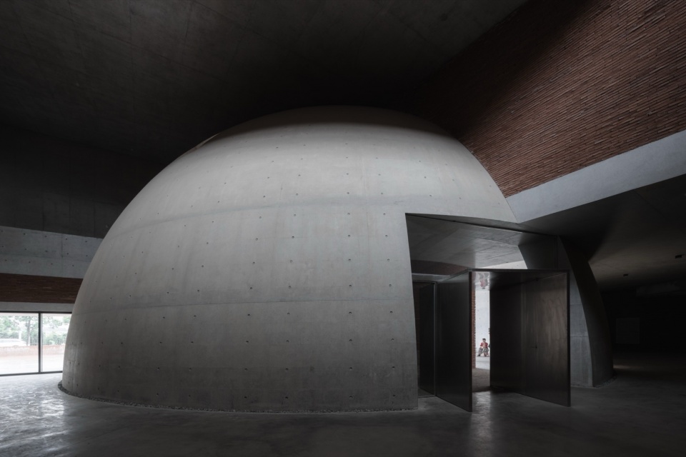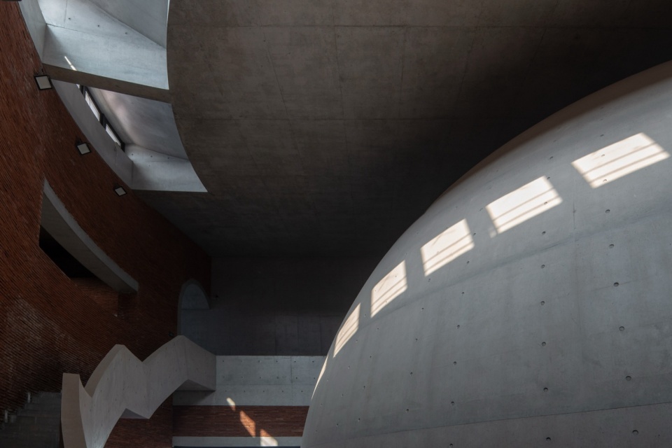Multiple irregular barrel vaults and ecological shafts are integrated, creating a cave-like spatial matrix that allows airflow, light, rainwater, mist, and natural soundscapes to flow freely between interior and exterior. The 18-meter-span concrete hemispherical dome at the main entrance, with its primal and immersive volume, serves both as an urban space for public assembly and the structural and spatial core of the undulating roof.