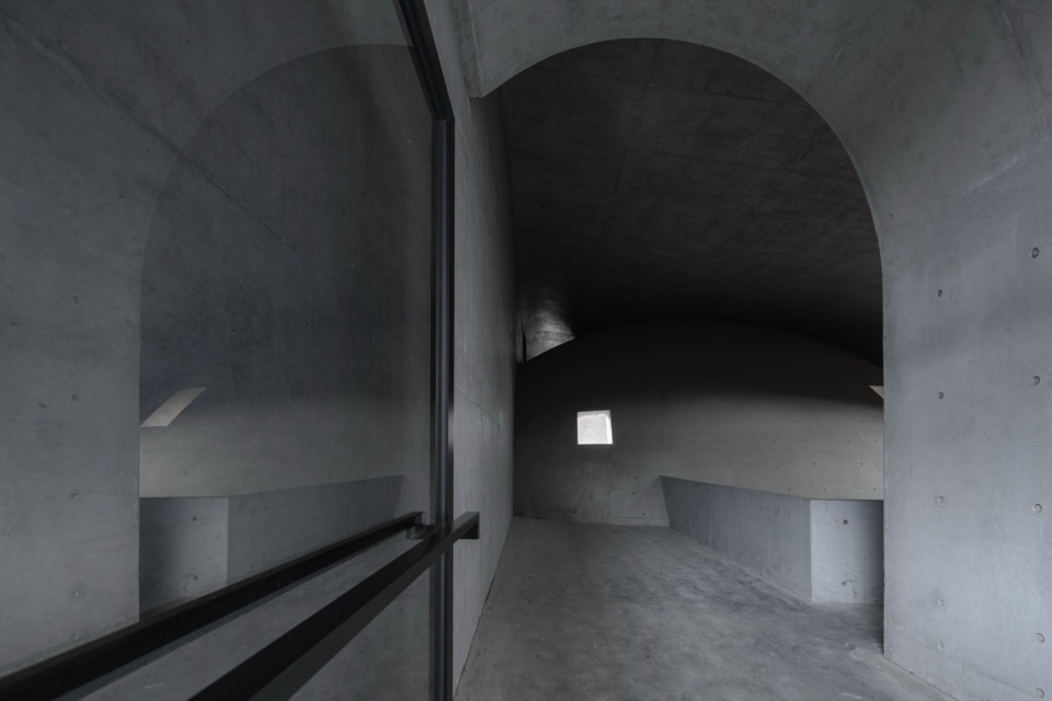 多个异形筒拱与生态竖井被植入其中,构建出类似洞穴的空间基质,使气流、光线、雨水、雾气与自然声景在室内外自由流动。主入口处18米跨度的混凝土半球穹顶空间以其原始而沉浸的体量感,既承担公共集会的城市功能,又作为起伏屋面的结构与空间核心。