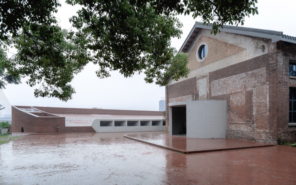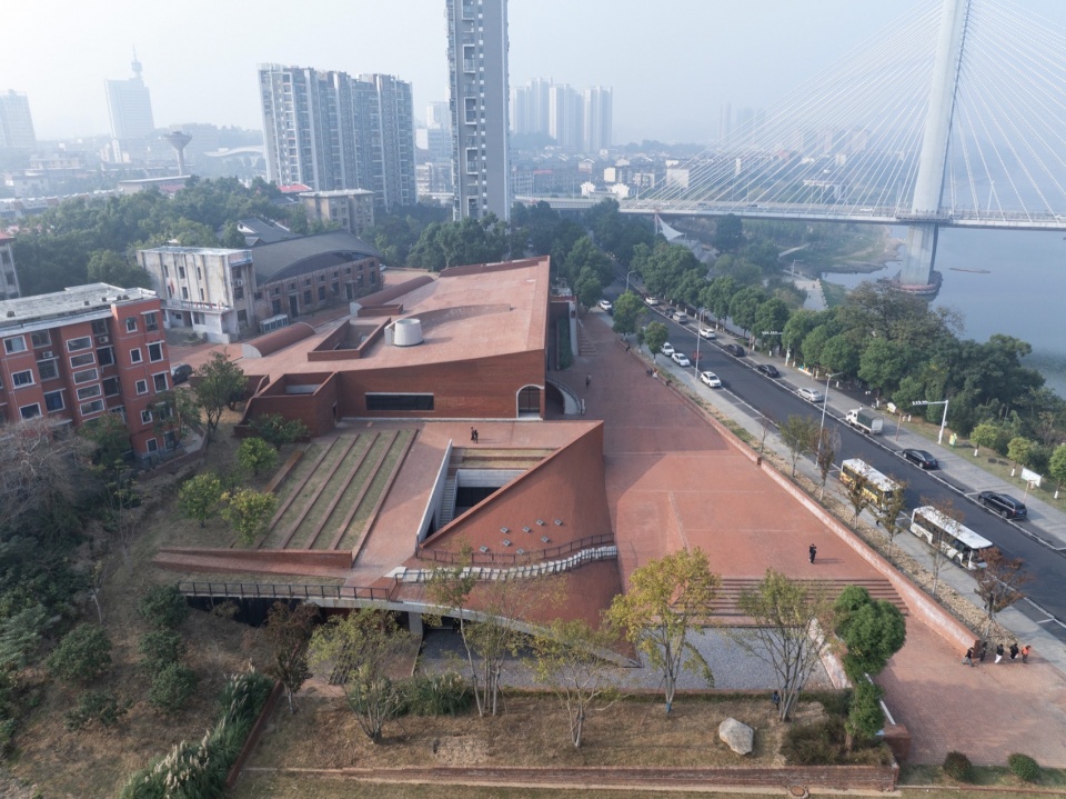 三周文化广场的设计摒弃了纪念碑式的视觉语言,选择以“地景化”方式介入江岸陡坡,将主体空间倚靠在山体的断崖深处,通过覆土的生态思维使新建体量成为地形演变的自然延续。