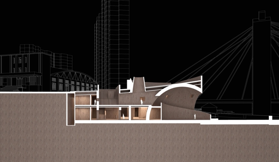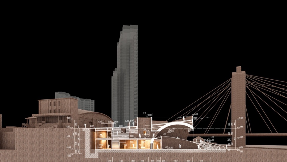 嵌入断崖的半球穹窿空间源自地质溶洞的原型意象,其内部盘旋而上的弧形坡道隐喻山区码头的高台阶形态,串联起江岸入口、屋顶观景平台与城市腹地,构成完整而连续的立体流线体系。