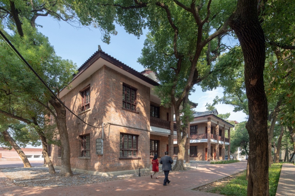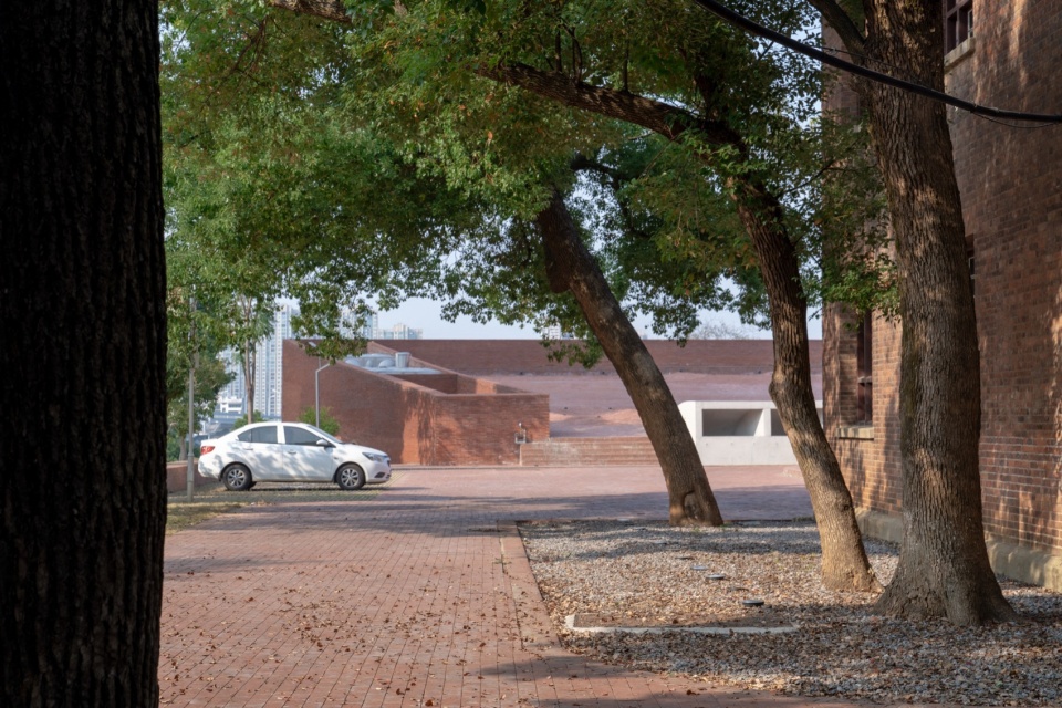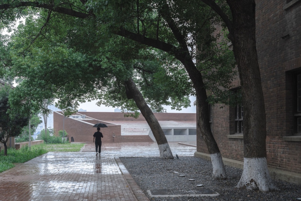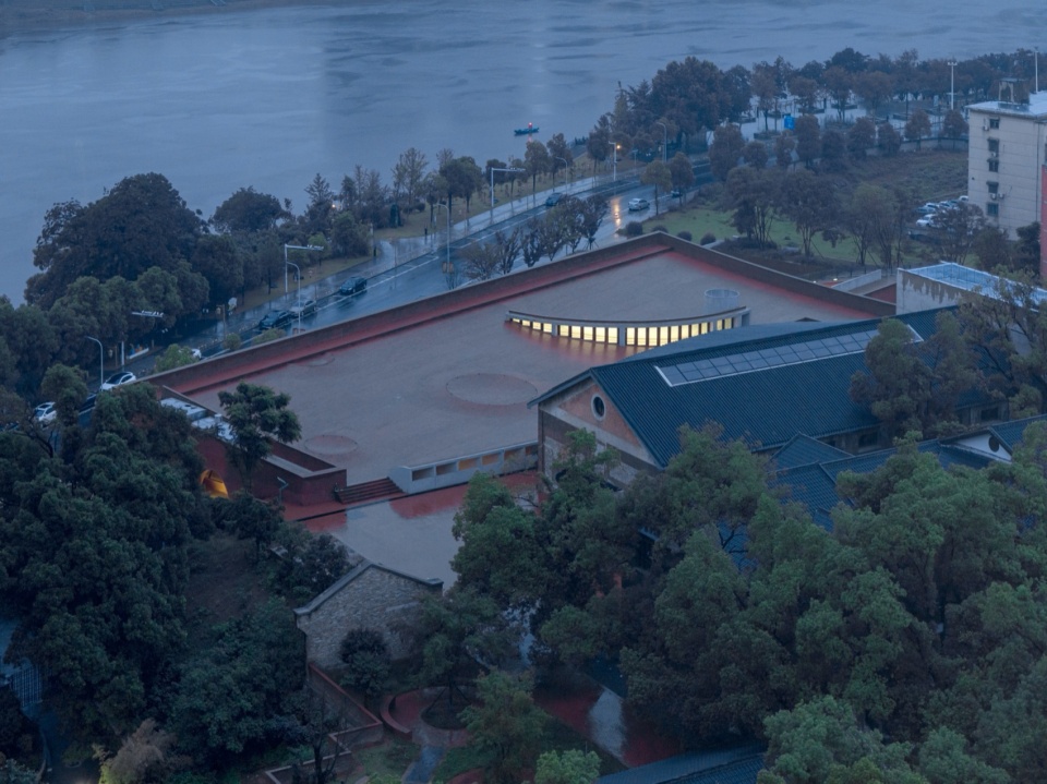 屋顶界面最低点与山顶历史建筑地坪精确衔接,微起伏的红砖铺装分别在色彩上与肌理上呼应山坡的红壤土层。场地中散布的圆形洼地打破了铺装的均质秩序,雨时映照天空,晴日则转化为儿童与滑板的活动场所。