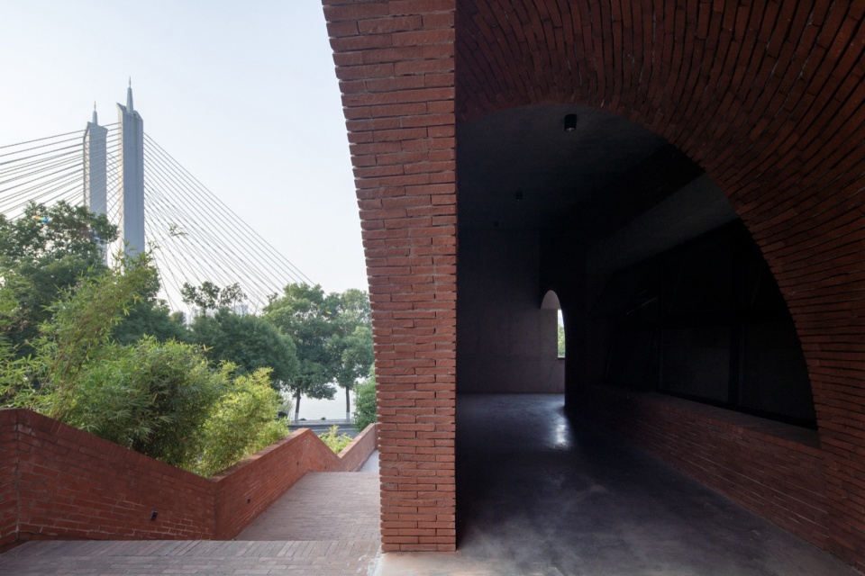 ▼微起伏的红砖铺装分别在色彩上与肌理上呼应山坡的红壤土层, the gently undulating red brick paving echoes the color and texture of the hillside’s laterite soil