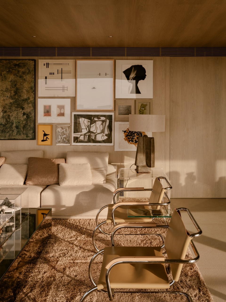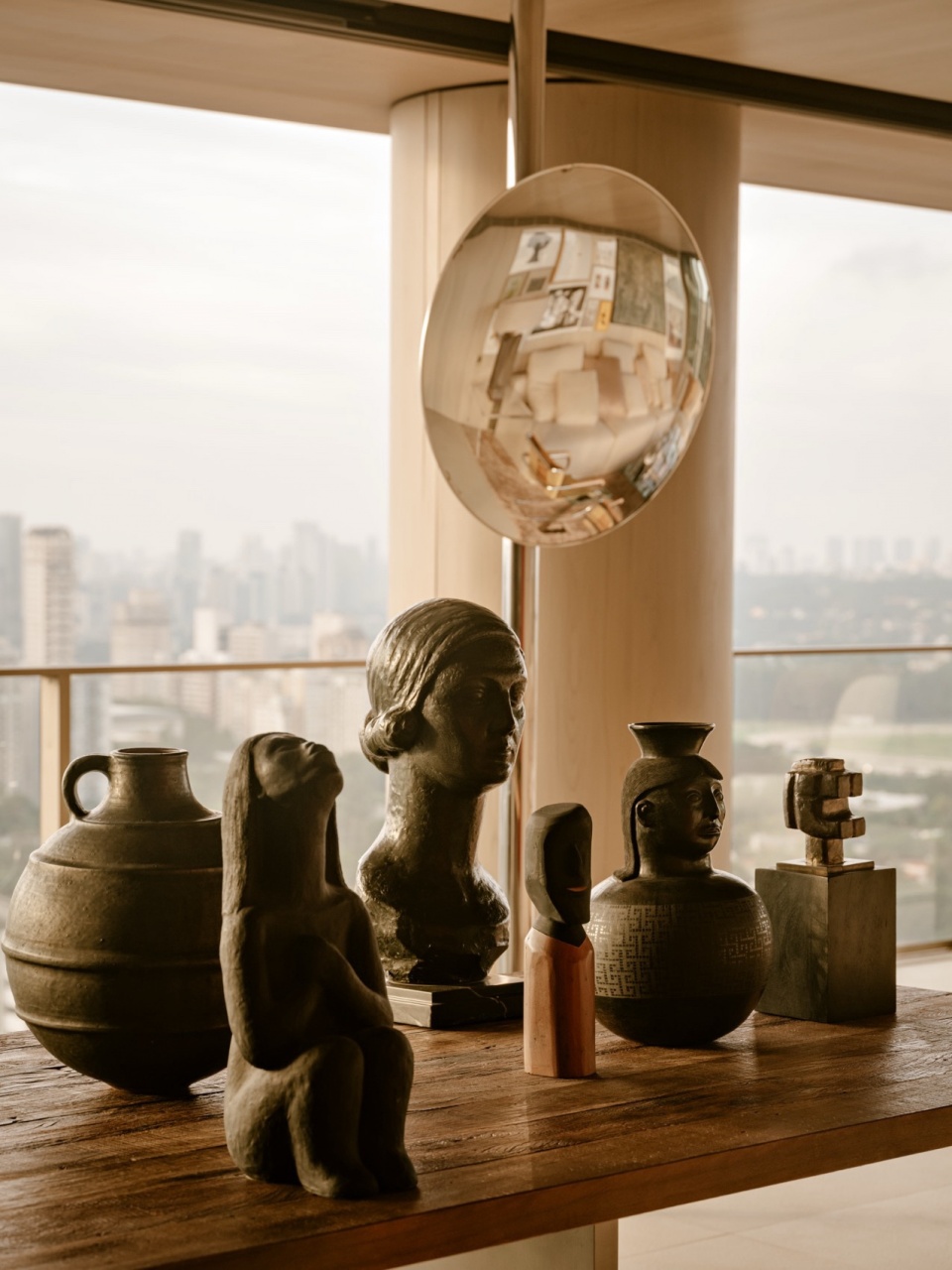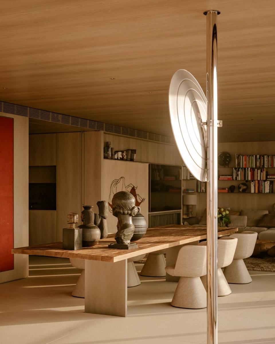 With around 300 sqm, the apartment’s layout was designed to eliminate unused spaces, prioritizing direct circulation and versatile environments. Full automation, custom solutions, and extensive use of natural materials create a precise, welcoming atmosphere that blends comfort and control, with visual neutrality to display his collection of items, including artwork, sculptures, books, photographs, cherished objects, and design pieces. “Designing for myself is very easy. I’m the best client for myself because I know what I like and how I live,” says Arthur Casas.