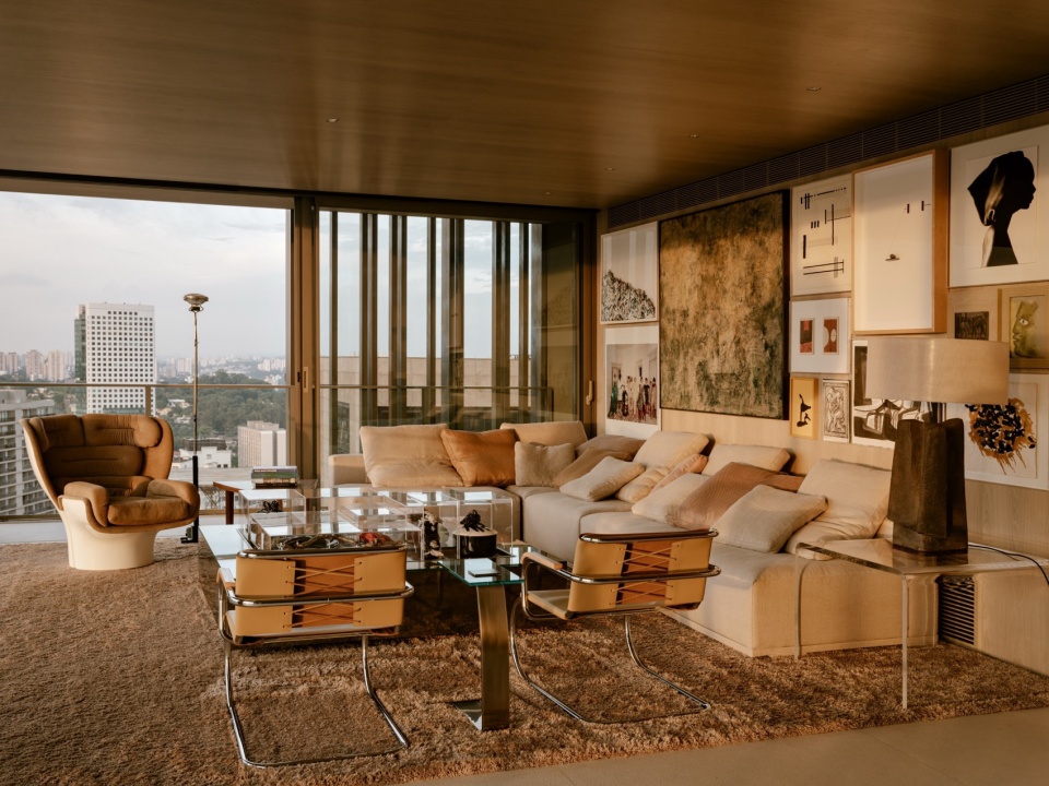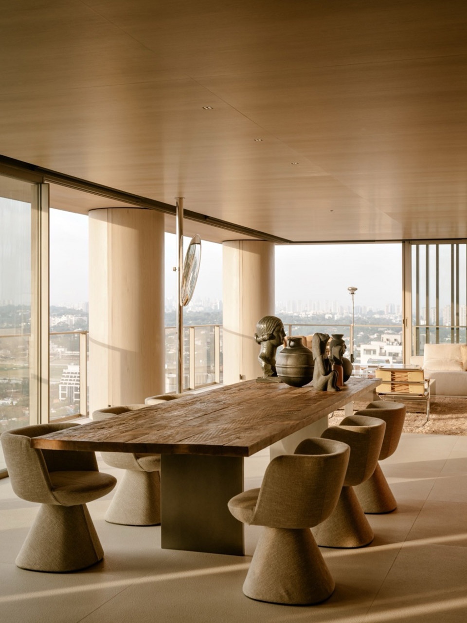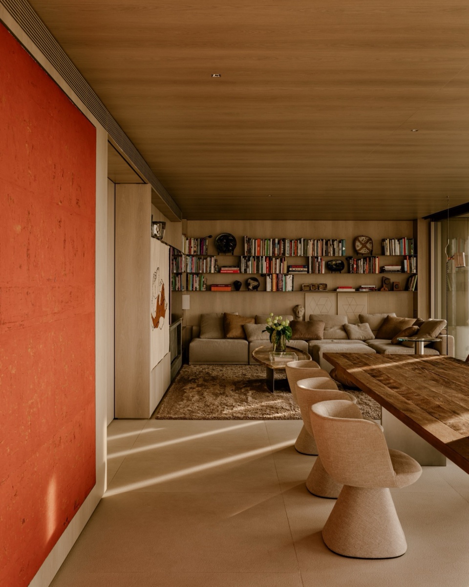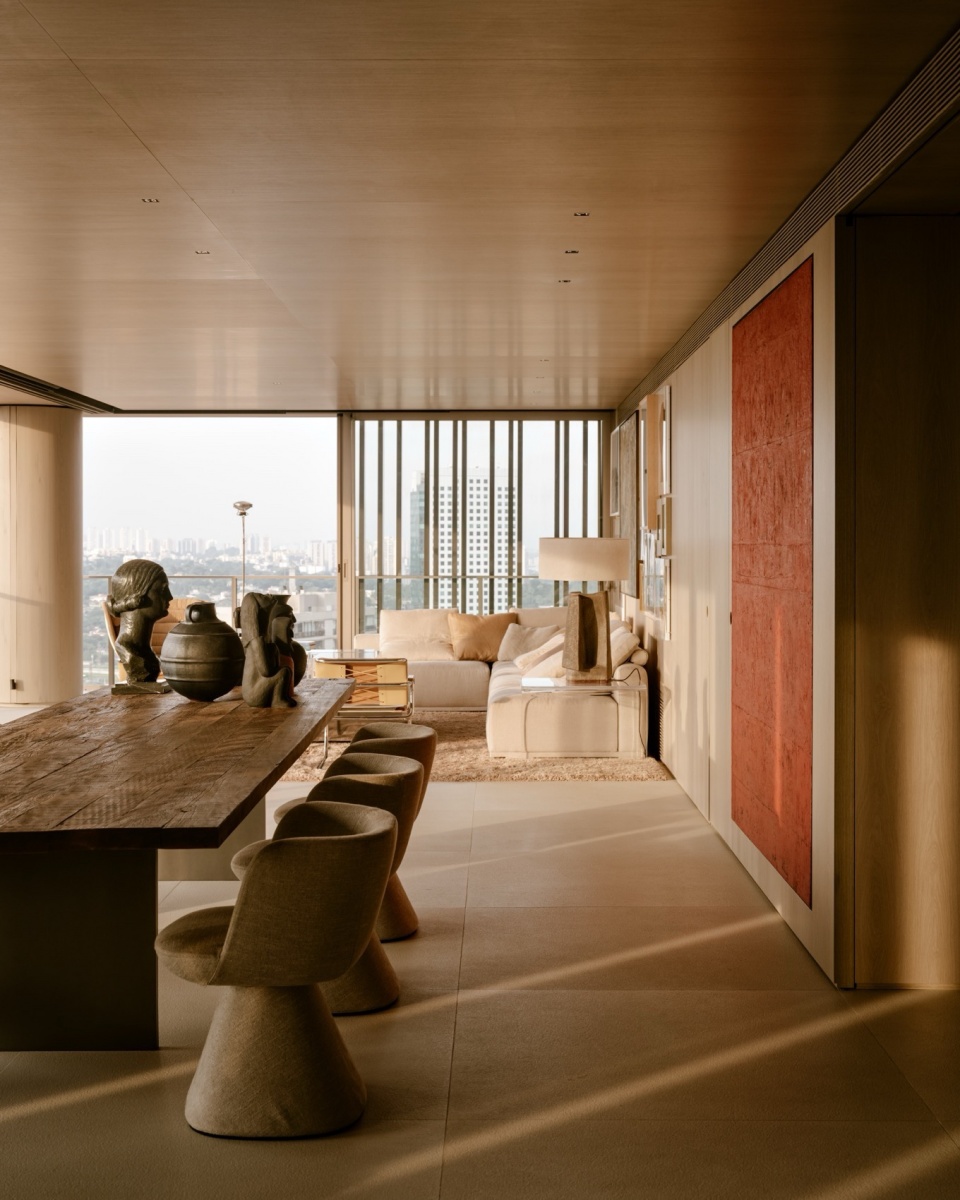 With around 300 sqm, the apartment’s layout was designed to eliminate unused spaces, prioritizing direct circulation and versatile environments. Full automation, custom solutions, and extensive use of natural materials create a precise, welcoming atmosphere that blends comfort and control, with visual neutrality to display his collection of items, including artwork, sculptures, books, photographs, cherished objects, and design pieces. “Designing for myself is very easy. I’m the best client for myself because I know what I like and how I live,” says Arthur Casas.