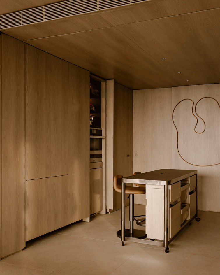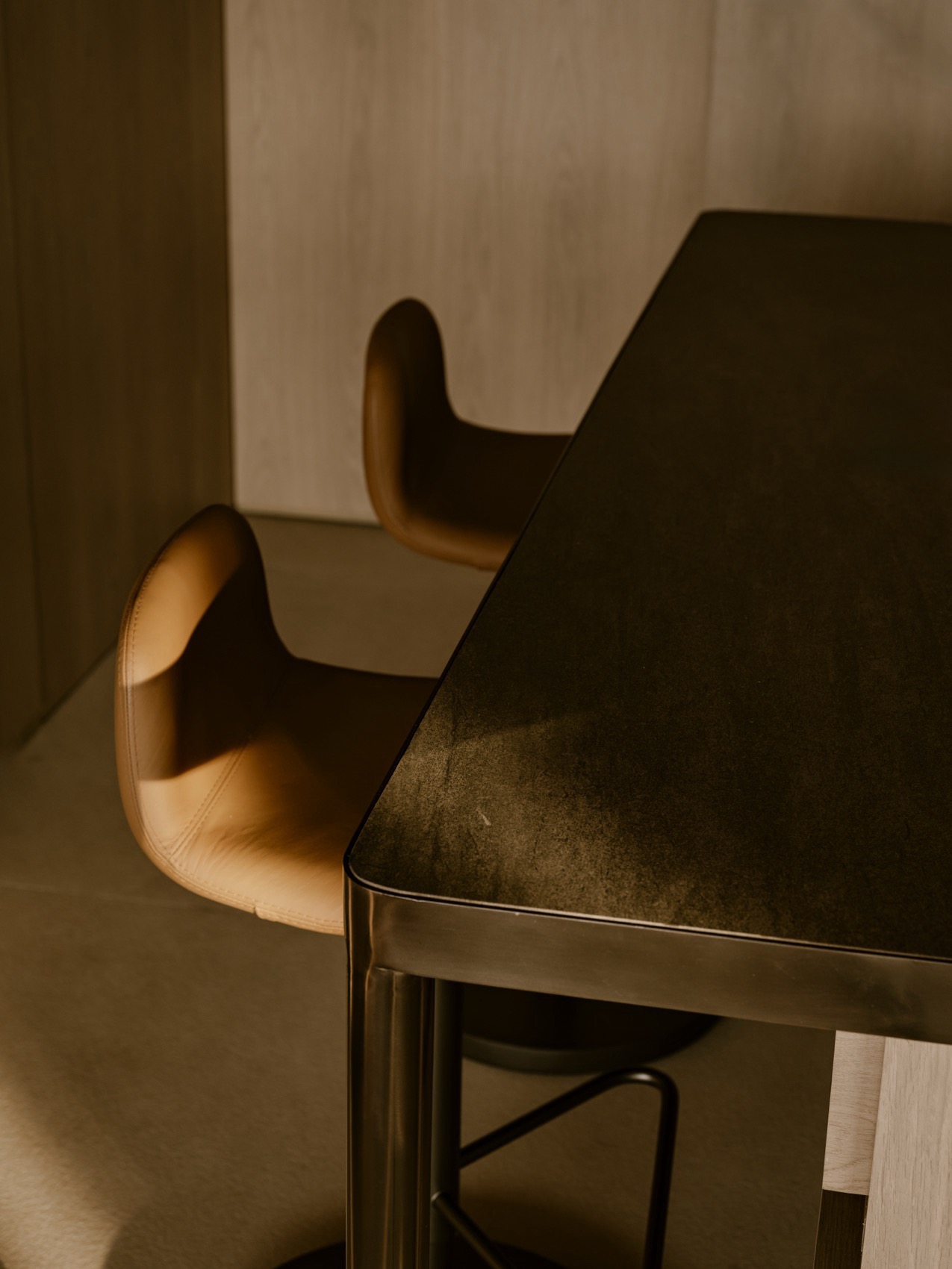 厨房中,Disco吧椅(Arthur Casas × Studio Objeto)与Neolith Basalt Grey岩板台面形成视觉焦点。橱柜由Arthur定制设计,将家电巧妙隐藏,使厨房既可与公共区域完全融合,也可通过滑动门独立封闭。