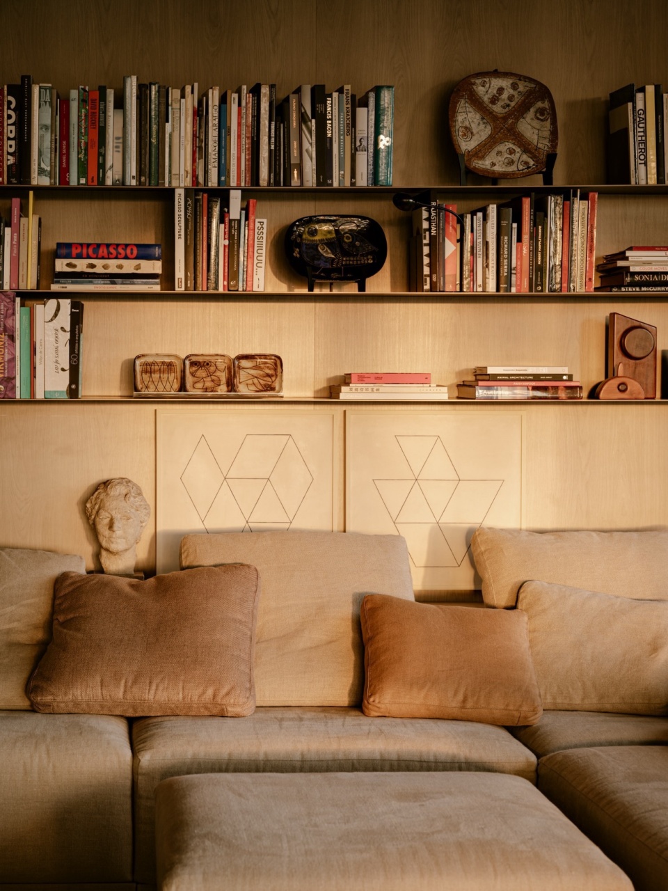 Adjacent to the kitchen, the home theater revisits the Fusca sofa, now paired with a Tavolino 1932 side table (Gio Ponti), the Marsala armchair (Michael Ducaroy for Ligne Rosset), and a Henri Laurens tapestry. On the shelves, sculptures and plates by Livia Gorka, Pablo Picasso, and Jean Lurçat coexist with books and cherished objects. Above the composition, paintings by Mona Gorovitz and a sculpture by Ernesto de Fiori complement the scene.