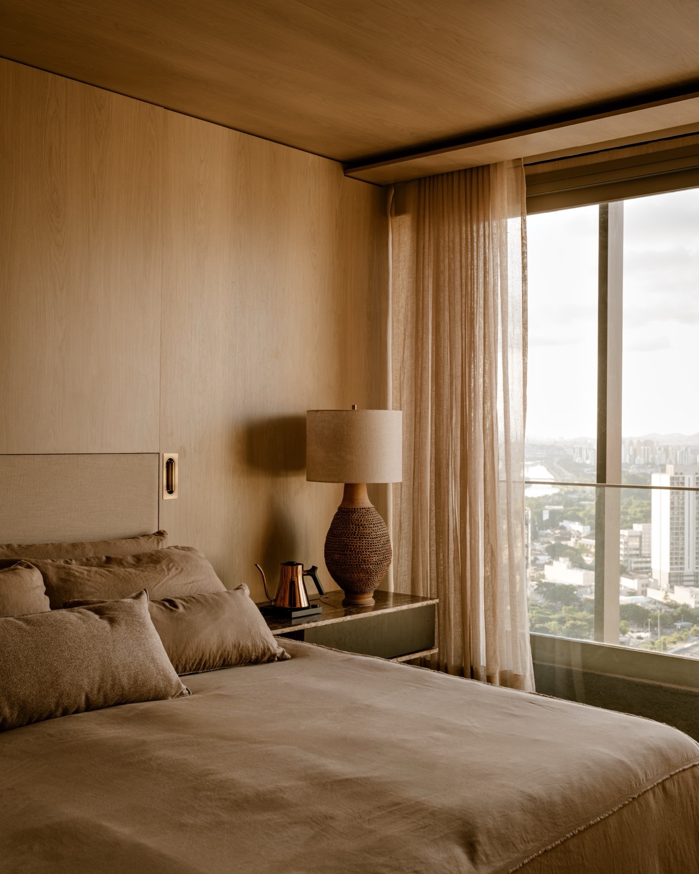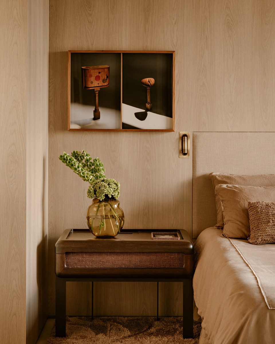 通往卧室的走廊以木饰面包覆,营造平缓而安静的过渡。墙面陈列摄影收藏,包括Pierre Verger、Mario Cravo Neto、Bob Wolfenson与Cristiano Mascaro的作品。主卧套房以柔和光线为主调:复古台灯、Marset的Ledtube壁灯、1960年代California Studio陶瓷灯,与连续木质天花及定制家具共同构成温润氛围。Giuseppe Scapinelli扶手椅与Via Appia大理石床头柜点缀其间,墙面则陈列Tarsila do Amaral、Emiliano Di Cavalcanti、Athos Bulcão与Flávio de Carvalho等艺术家的画作。