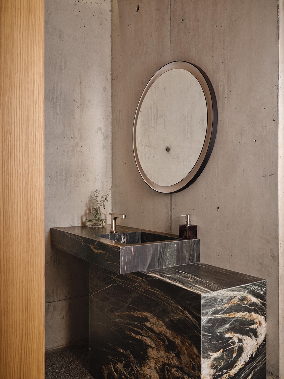 住宅入口位于前部悬挑体量之下,通过一扇竖纹压花玻璃门进入,在提供必要自然采光的同时,维护了临街密集环境中的私密性。混凝土构成了住宅的服务核心,将建筑牢固锚定于断崖之中,并同时承担结构、支护与热惰性体的多重功能。流线空间与主要房间则以木作定制家具加以围合,与原始的结构形成富有触感的对比。上方,白色涂装的采光天窗将自然光引入建筑深处,显著降低对人工照明的依赖。整体材料体系强调耐久性、可修复性以及长期的材料性能表现。