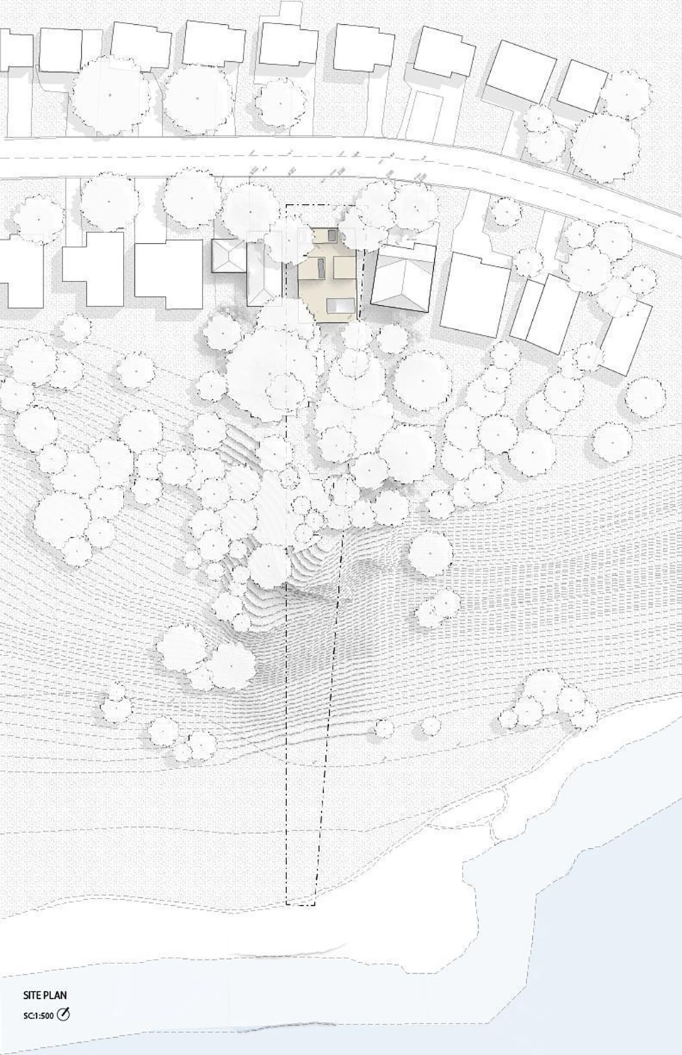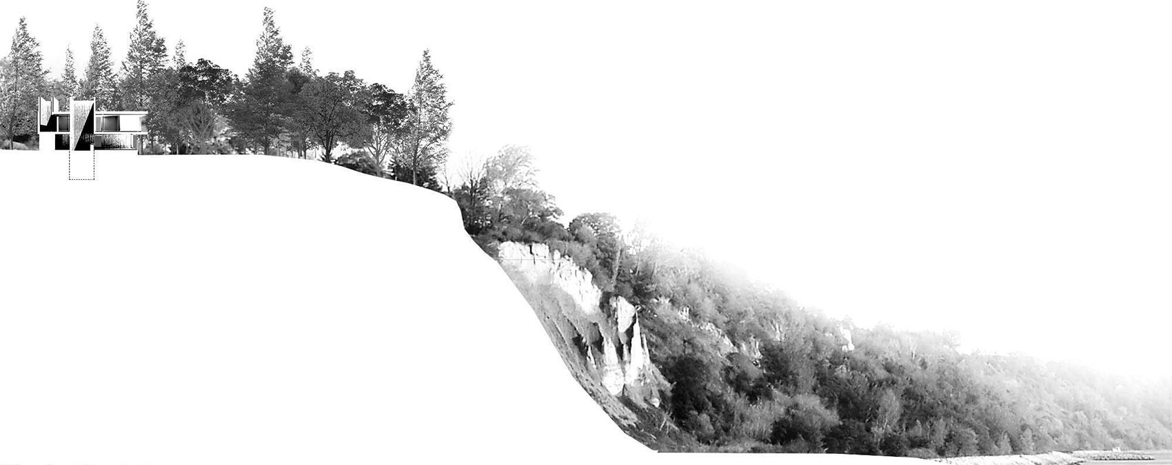 The Scarborough Bluffs lie along Toronto’s East End, where erosion once retreated the land by a metre/year. In the 1960s, conservation efforts planted the bluff to stabilize erosion and protect suburban development that had advanced to the edge. What appears natural today is largely artificially constructed. This condition forms the context for the House of Monitors: a 300-foot-high engineered escarpment supporting a narrow sliver of tableland on a suburban street. In response, the project adopts a restrained footprint and carefully positioned massing to respect neighbouring houses and the fragile edge condition, prioritizing long-term stability, discretion, and stewardship over visual prominence.