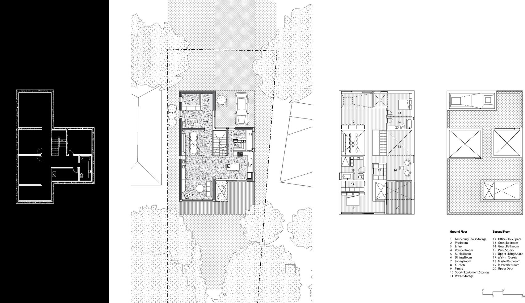 士嘉堡断崖位于多伦多东区,曾因侵蚀作用而以每年约一米的速度向内退缩。20世纪60年代,为稳定地形并保护已逼近断崖边缘的郊区开发区,相关部门通过大规模植被种植进行生态修复。今日所见的“自然”景观,在很大程度上实为人工构建的结果。这一背景构成了采光之屋的场地语境:一处高达300英尺的工程化陡坡,支撑着郊区街道上一条狭窄的台地地带。对此,项目采取了克制的建筑占地与谨慎的体量布局,在尊重相邻住宅与脆弱边缘条件的同时,将长期稳定性、低调性与场地守护置于视觉张力之上。