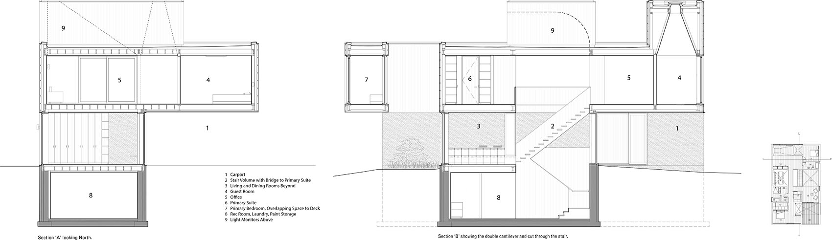 Entry occurs beneath the front cantilever through a reeded glass door, providing essential daylight while maintaining privacy along the closely spaced street edge. Concrete forms the service core of the house, anchoring it to the bluff and performing simultaneously as structure, shoring, and thermal mass. Circulation and primary rooms are lined with wood millwork, establishing a tactile counterpoint to the raw structure. Above, white painted light monitors amplify daylight deep into the plan, reducing reliance on artificial lighting. The elemental palette prioritizes durability, repairability, and long-term material performance.