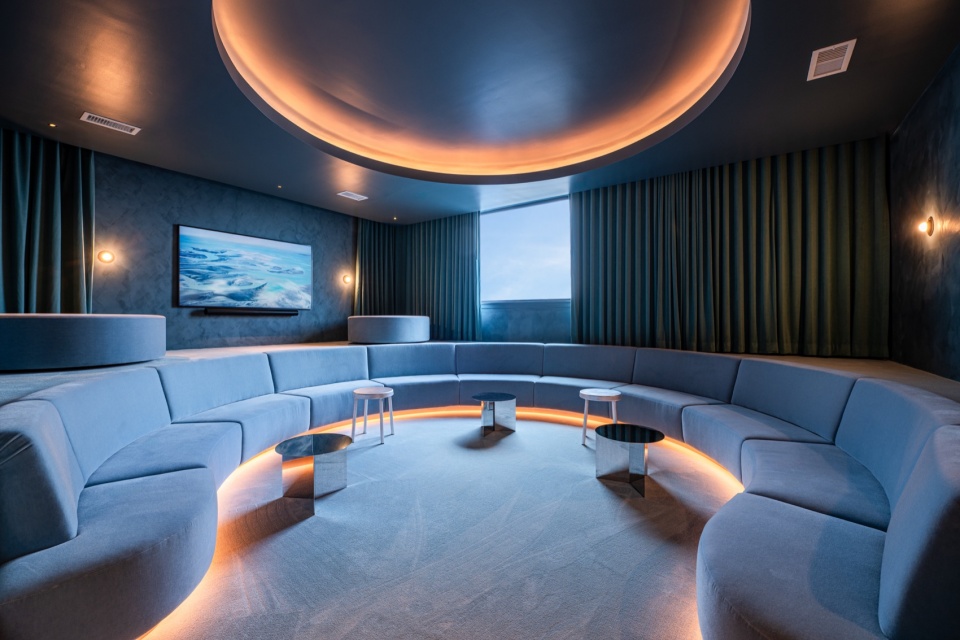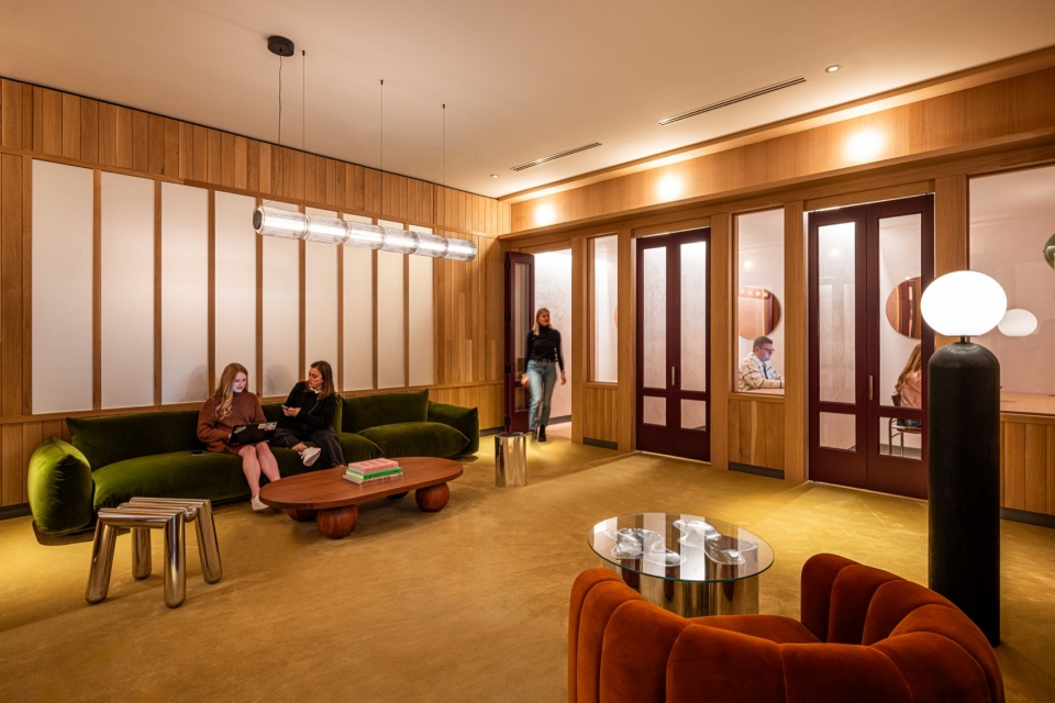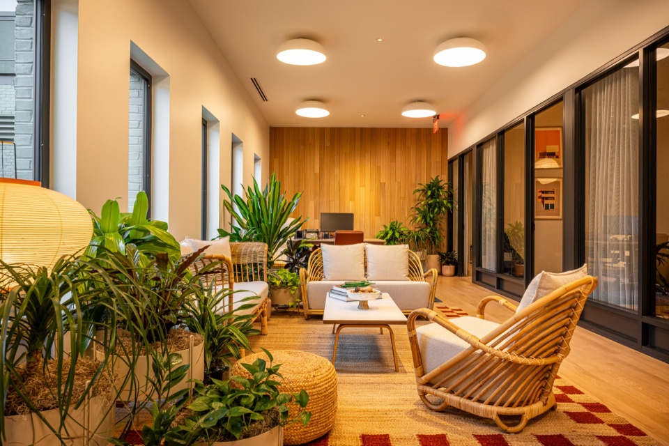 Retail spaces activate nearly every corner of the building, ensuring a lively ground-level experience. Above, a communal terrace on the fifth floor, designed by Eliane Le Roux, offers residents sweeping views across Philadelphia. These views can also be admired from the speakeasy, interior design by Yuria Kailich, which offers another unexpected hideaway within the building.
