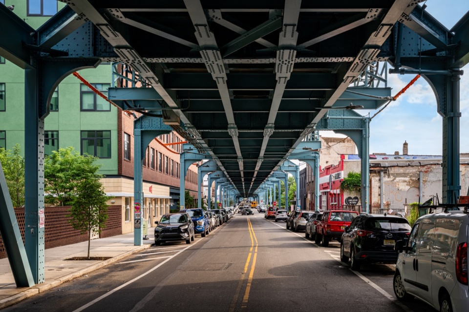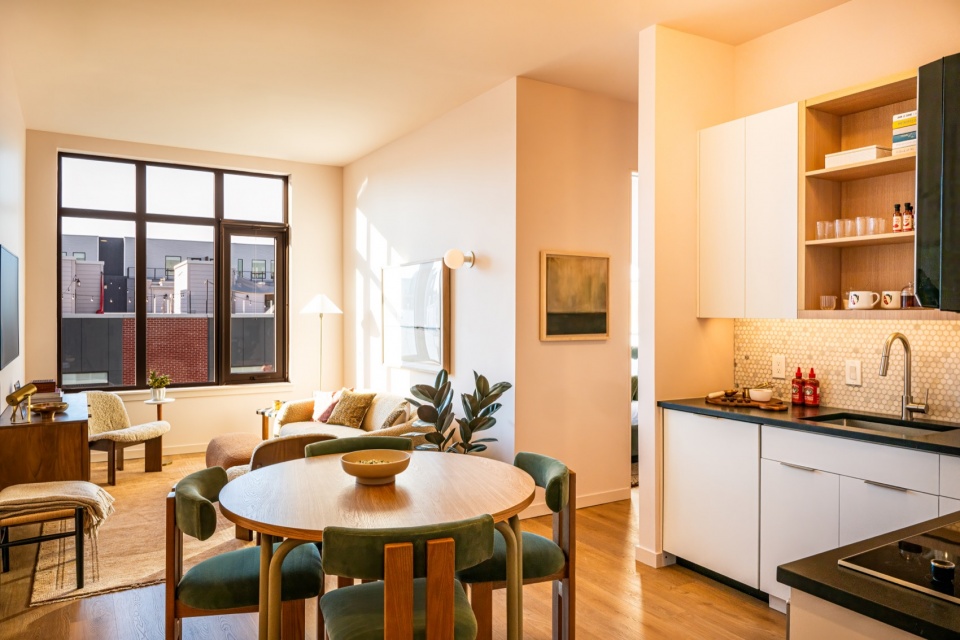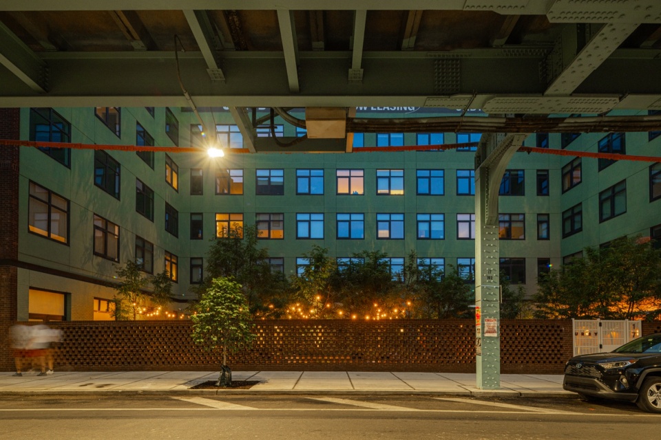 The building’s traditional brickwork paired with large dark-gray windows, allows it to blend seamlessly into the surrounding neighborhood. The windows proportions are carefully considered to maximize the flood of natural light to flow through the residences while maintaining privacy and soundproofing from the street and elevated train. Wrapped continuously around the building, the windows echo the rhythmic characteristic patterns of industrial architecture. The varied transom height is thoughtfully designed to align with the interior layout: lower transoms ensure privacy in bedrooms, while higher ones open up expansive views from the living rooms, balancing both functionality and aesthetic appeal.