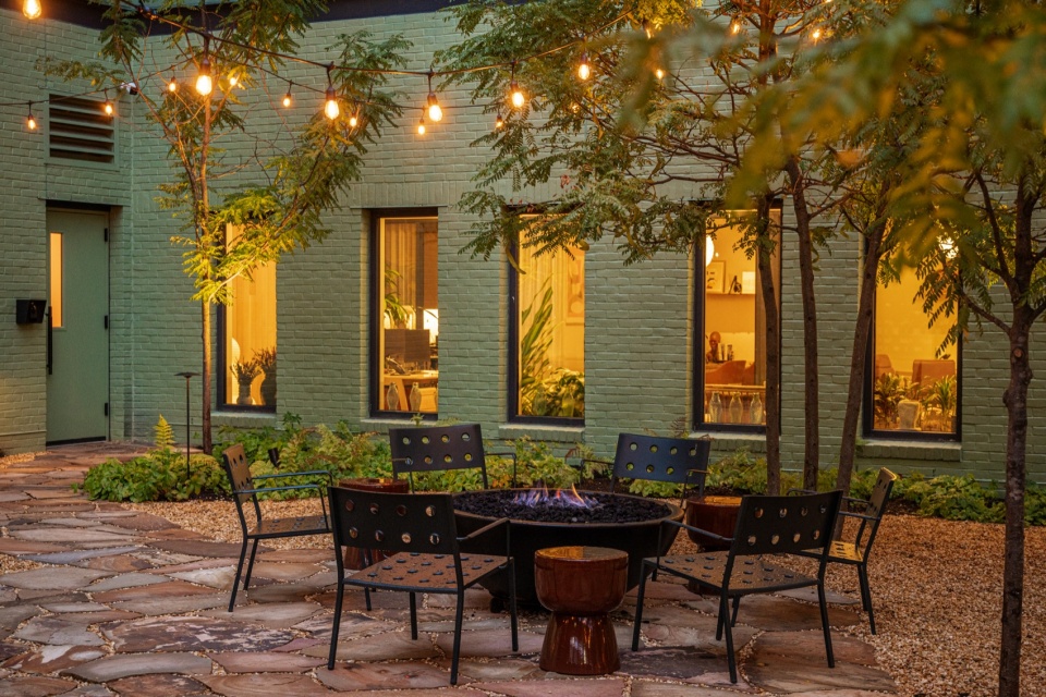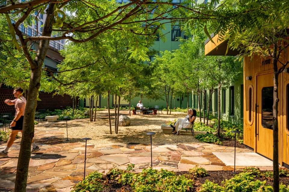 沿 North Front 街,建筑向城市敞开一处亲切而开放的庭院空间,庭院自然延伸至街道,形成充满活力的主要居住入口。该庭院由比利时景观建筑师 Bas Smets 设计,茂密的绿植与开阔的天空视野,为高架铁路下方喧闹的城市环境提供了一处清新的缓冲地带。温暖的绿色灰泥包裹着空间,使建筑与植被融为一体,营造出安静而私密的氛围,同时也为 Shawn Hausman Design 设计的咖啡露台提供了宜人的场所。
