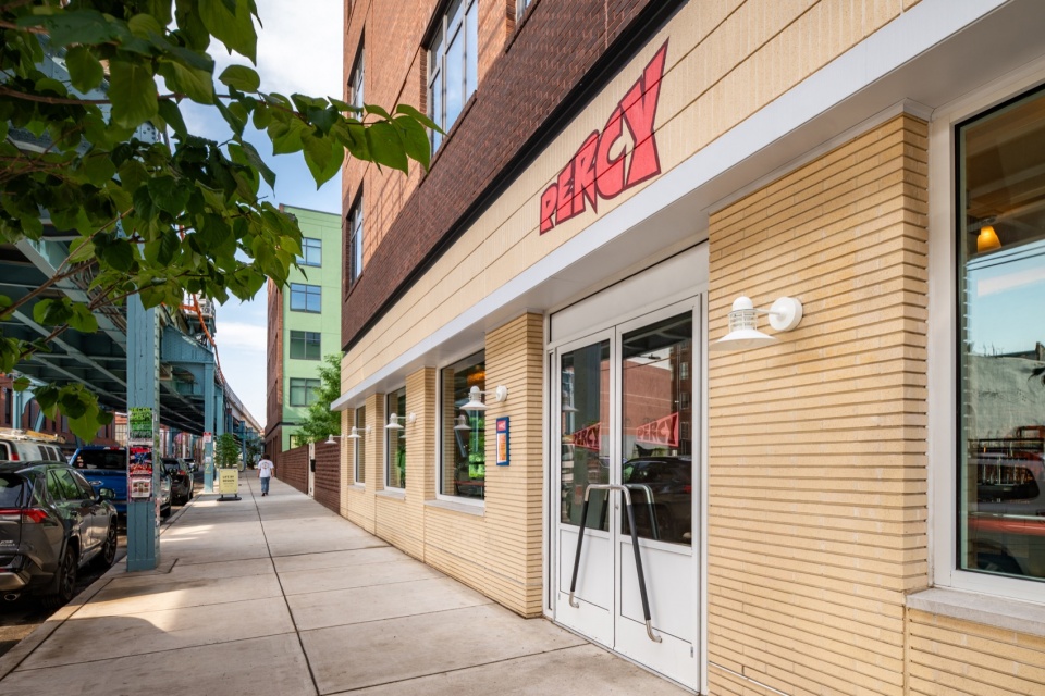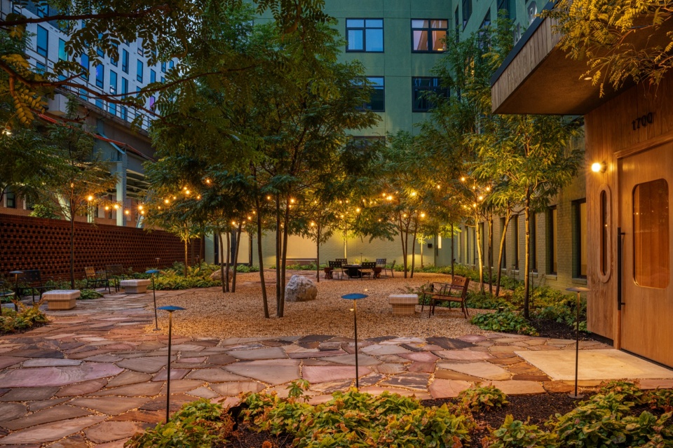 Along North Front Street, the building opens up to a welcoming courtyard that flows naturally into the street, creating a lively main residential entrance. Belgian landscape architect Bas Smets designed the courtyard, filled with lush greenery and an open view of the sky, offering a refreshing escape from the energy of the street below the elevated train. A warm green stucco wraps the space, blending the architecture with the lush planting and creating a calm, intimate atmosphere and an inviting setting for the café terrace designed by Shawn Hausman Design.