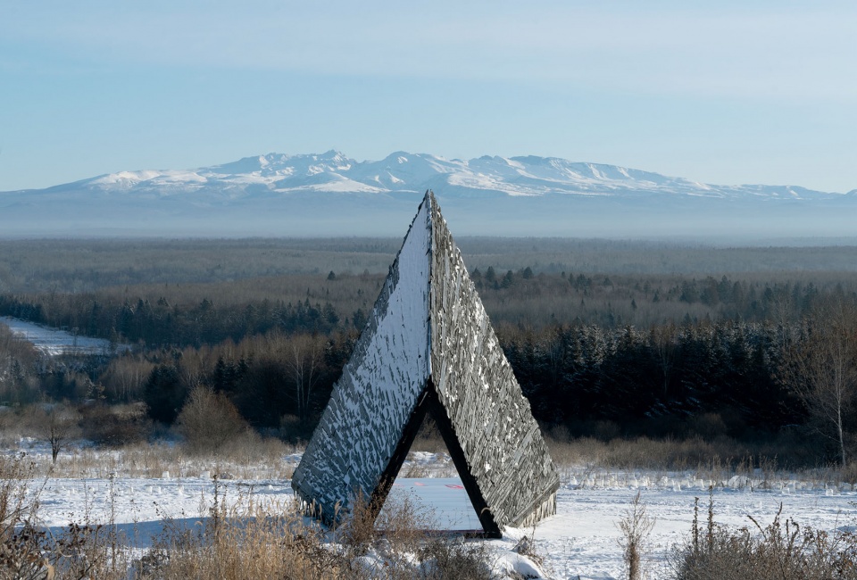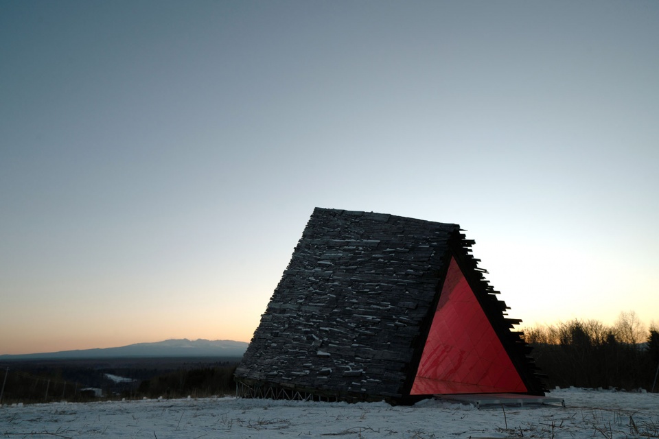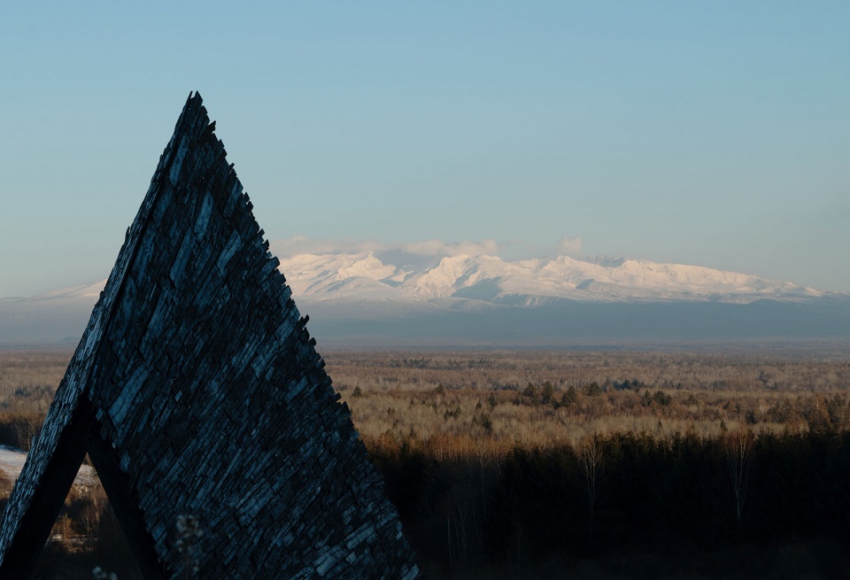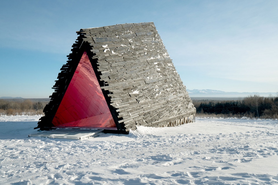 长白山周边曾是出产木材的林场,如今因环保停止砍伐,但原始木料拼搭的小木屋仍是常见的建筑类型。作品延续这种直接、原始的建造质感,使其与风雪、林海与大尺度地景保持同频。
